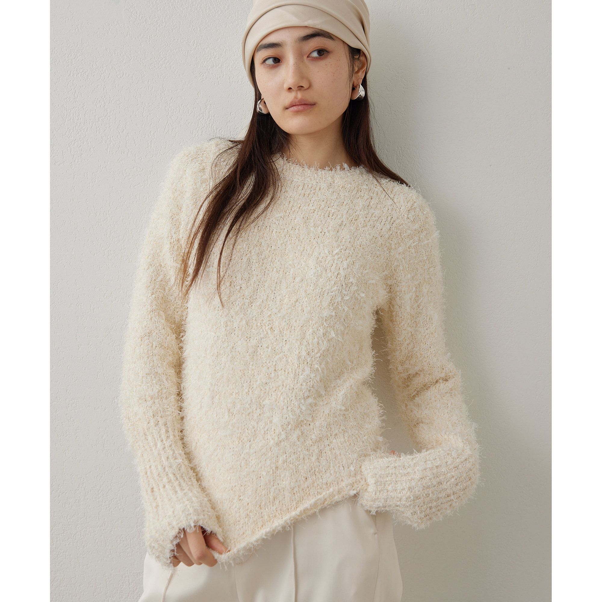 【2023AW】素材の表情がアクセントになる、軽やかなニットプルオーバー■ゆったりとしたリラクシーなシルエットのファーニットプルオーバー。■2本の糸を撚り合わせMIX感のあるニットに仕上げ、ふんわりとした表面感と目の立った存在感のある編地が魅力。■深めのVネックとやや短丈のデザインはレイヤードもしやすく、様々なボトムと好相性。■肩がずり落ちずにVネックのシャープ感をキープしてくれるネックラインもポイント。■シャツやブラウスに合わせたり、クロップド丈を活かしてワンピースとのレイヤードスタイルも楽しむのもおすすめ。【COLOR】オフホワイト:大人の可愛さを引き立てるピュアなオフホワイト。ライトベージュ:暖かみのあるカラーが女性らしい杢ベージュ。サックスブルー:大人のカラーコーデにぴったりなブルーグリーン。グレー:トレンドライクなムードに仕上げてくれるシックなグレー。【MATERIAL】ふくらみ感と毛足が特徴のヤク混の糸とループ糸を引き揃えて起毛し、さらに毛足を出した糸を使用した編地。【STAFF COMMENT】■身長156cm|普段サイズ M〜L|着用サイズ FREEエアリー感を持つニットが、潔いVネックが入ることによってスタイリッシュさも加わります。インナーはキャミソールからカットソー、ボウタイブラウスなど幅広く着回せますよ。カラー展開豊富。私の身長でも合わせやすい丈感で活躍間違いなしです。■身長166cm|普段サイズ M〜L|着用サイズ FREEサテンキャミやチューブトップを合わせていただくと抜け感が出て女性らしくなります。ボリューム感のあるニットですが、Vデザインが全体的にすっきりと見え、着膨れや膨張してしまうというお悩みがある方おすすめですよ。----------------------------------------------------洗濯方法:ドライクリーニング透け感:なし裏地:なし伸縮性:あり光沢感:なし----------------------------------------------------※画像の商品はサンプルです。実際の商品と仕様、色味が若干異なる場合があります。※入荷状況によりお届け予定が前後する場合があります。予めご了承ください。