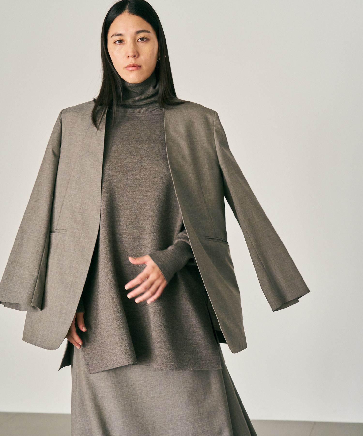 fabric-防縮加工を施した梳毛を使用。しっかりと度目を詰めてハリを出していますが伸縮性に富んだゴム地組織です。-design-襟ぐりのラインが体に沿ってスッキリ美しく、鎖骨あたりが華奢に見えるようなバランスのシルエットになっています。袖やボディーも細めですが、身体のラインを拾いすぎない絶妙なバランスです。ーーー