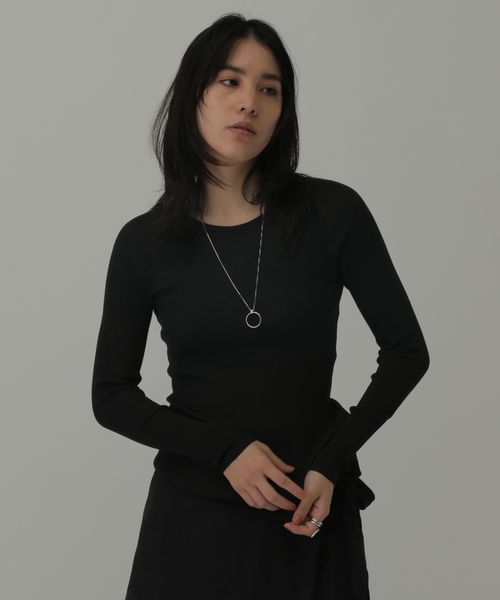 -fabric-シルク独特の「きしみ」を感じるハイゲージシルクニット。表と裏の糸を配色にしたプレーティング編みは同系色で組んでいるので深みのある色合いが魅力。キックバックに優れたリブ組織のインナーアイテムとなります。※引っ掛けやすく、扱いずらいというデメリットに目がいきがちですが大量の水を含む余計な加工を、極力施さない生産方法。ホームクリーニングできるのも嬉しいポイントです。-design-design-クルーネックはサドルショルダーで肩まわりのアタリをやさしくし、袖山中心、脇にライン状の組織変化でデザインポイントを加えています。ーーー