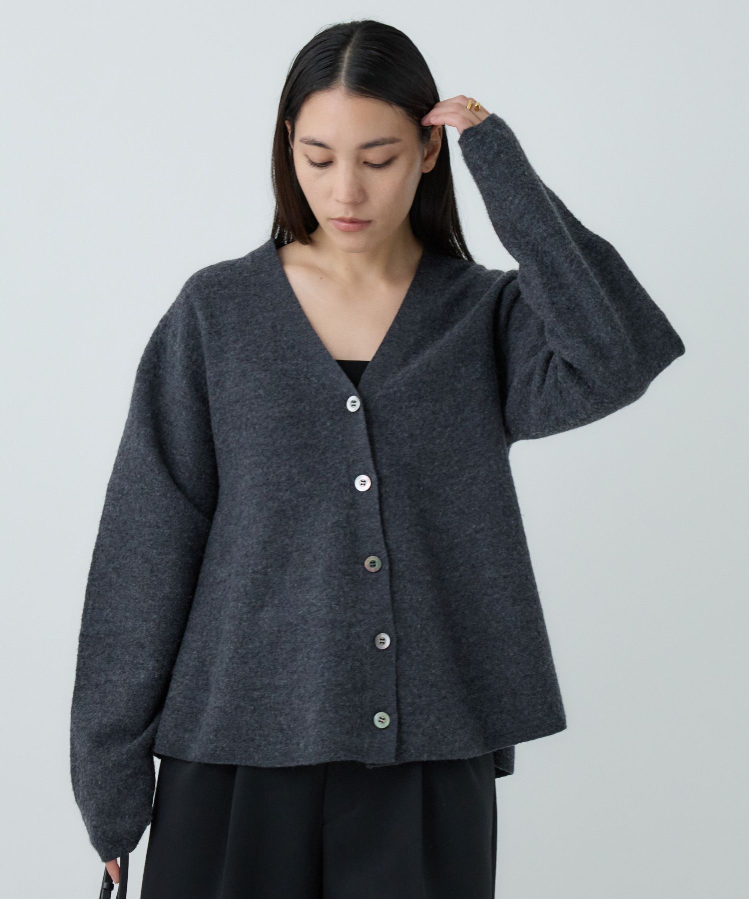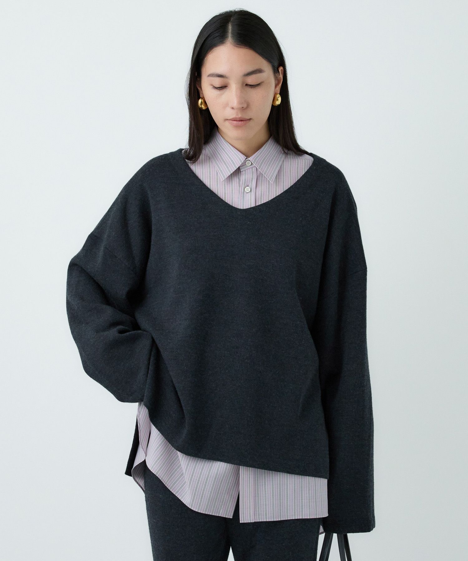 -design-オーバーサイズのざっくりVネックになります。着丈も長めなので、パンツにもスカートにも合わせやすいニットになっております。同素材のパンツと合わせて、セットアップとしても着用可能です。-how to care-こちらの商品は手洗いでのお洗濯が可能です。-fabric-Super120Sの3/72という細番手を3本撚りあわせた糸を使用しています。素材の良さを引き出すため最小限の加工に留めています。糸ムラが少なく、柔らかい風合いでありながらハリのある素材感が特徴です。着心地の良さを体感していただきたいニットです。