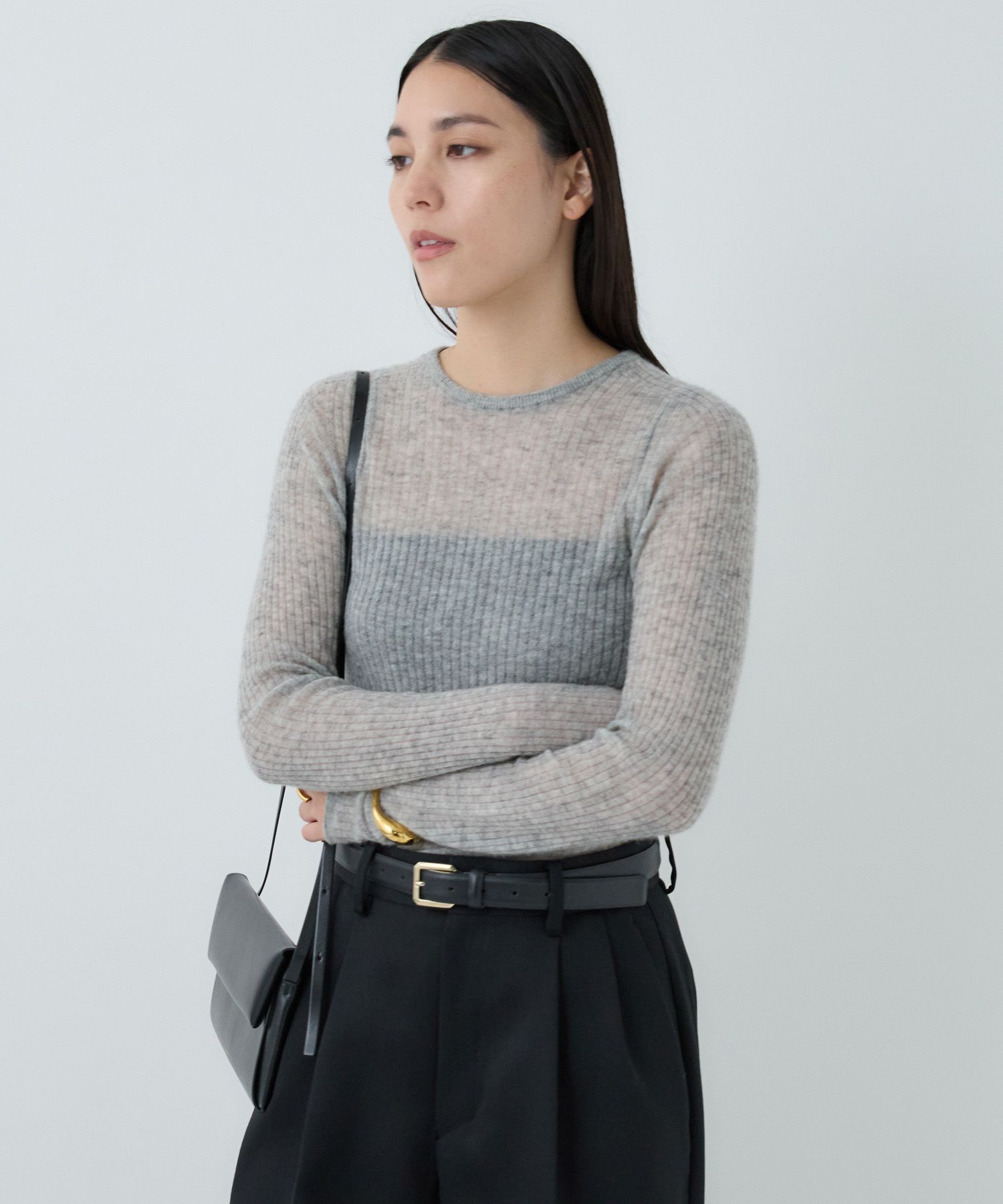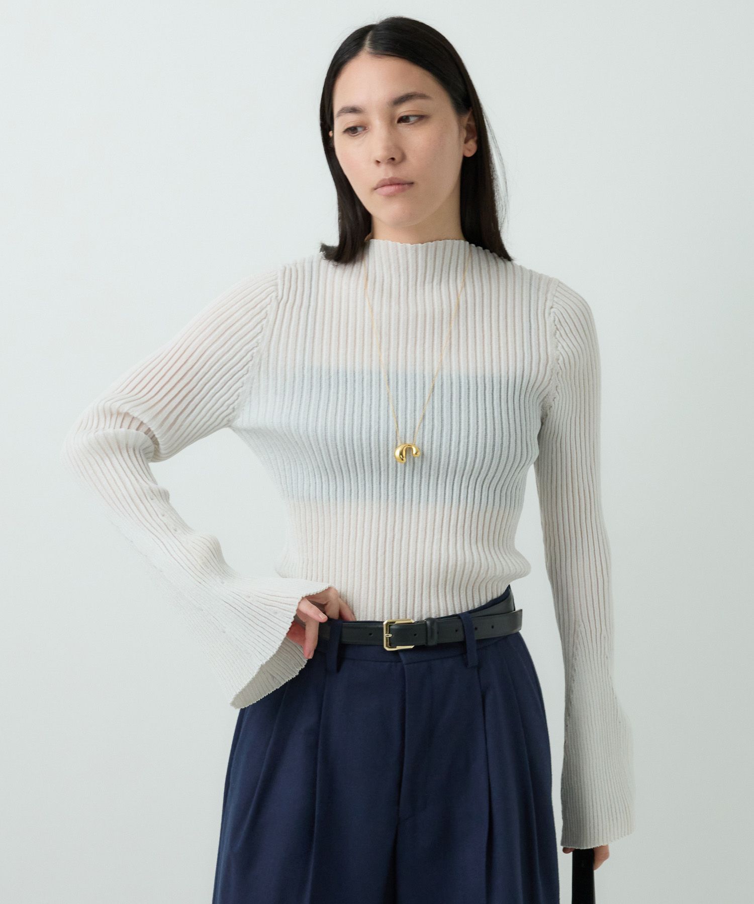 -fabric-シルク独特の「きしみ」を感じるハイゲージシルクニット。表と裏の糸を配色にしたプレーティング編みは同系色で組んでいるので深みのある色合いが魅力。キックバックに優れたリブ組織のインナーアイテムとなります。※引っ掛けやすく、扱いずらいというデメリットに目がいきがちですが大量の水を含む余計な加工を、極力施さない生産方法。ホームクリーニングできるのも嬉しいポイントです。-design-袖口の切り替えがポイントです。サイドネックから袖口に向けて1本の切り替えを入れることにより、サイドから見ると腕がきれいに長く見えます。フロントから見ても面積が小さいため、身体が華奢に見えるように切り替えを入れております。女性には嬉しい、計算されたポイントがたくさん詰まったニットです。ーーー▼同素材のシリーズアイテムはこちら▼174410・18Gシルクリブニット クルーネックプルオーバー