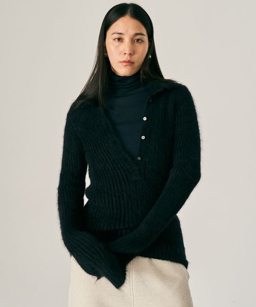 2025 FALL&WINTER COLLECTION-design-ワイドリブのニットポロ。インパクトのあるワイドリブでタイトシルエットなので、インナー映えするデザインです。大き目の衿と、タイトな身頃のコントラストがモード感があります。へアリーなニットポロは新鮮でおすすめです。-how to care-こちらの商品はドライクリーニングをお願いしております。-fabric-アルパカ全体の20%未満しか産出されない毛足の長い品種「Suri」を原料にした素材を使用しています。そのSuriの中でもさらに希少である生後1年未満のベビーを使用しているので軽く柔らかい毛並みが特徴になっています。製品で起毛加工を施し、その毛足の長さを最大限に引き出しています。 【Chaos(カオス)】「カオス」の時代にあっても、自由かつインディペンデントな感性を大切にする大人の女性たちへ。素材やディティールにこだわったオリジナルと国内外で買い付けたユニークかつアーティな感覚のセレクトをミックスした発信をしています。「大人の為の上質な日常着」
