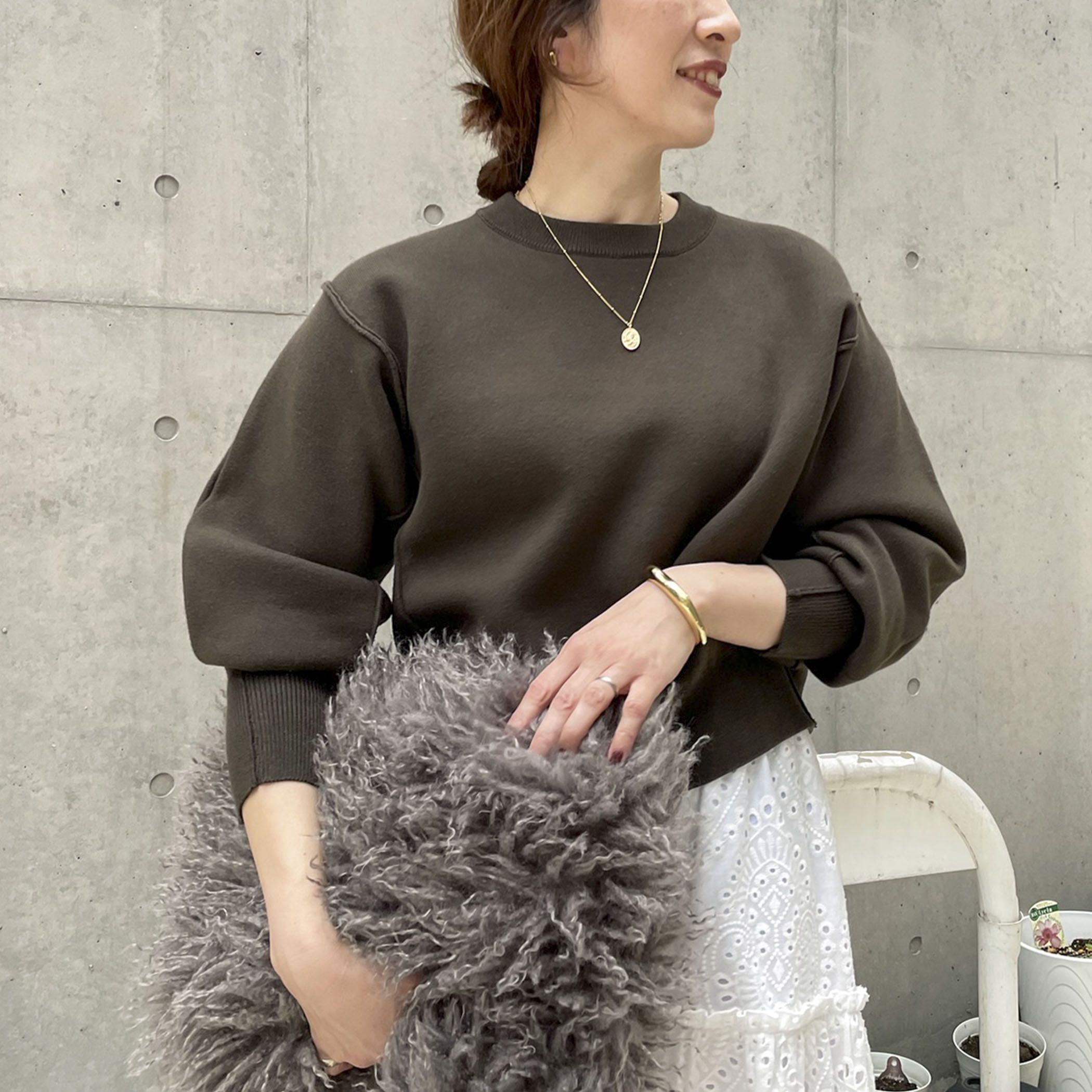 ◇25AW◇2nd NOLLEY'S◆Point・表側にコットン、裏側にポリエステルを使用した軽量で肌触りのいいニット・スウェットデザインのニットで、品もあり綺麗目に着こなせるデザイン・程良いショート丈、少しボリューム感のあるスリーブが拘りポイント・一枚でも、シャツをレイヤードしたスタイルもオススメ・ワイドパンツやロングスカートまで幅広いボトムに合わせに・バックネックにネイビーのカンヌキ入り・夏を除くロングシーズン着用可能※ダークブラウンはWEB&一部店舗限定色●お取扱い上のご注意●末永くご愛用頂くために、アテンションタグを必ずご確認の上、着用又はお取り扱い下さい。気になる商品は、お気に入り登録がオススメです!クーポン情報、入荷情報が、通知されるようになります。※手洗い可※店頭及び屋外での撮影画像は、光の当たり具合で色味が違って見える場合があります。商品の色味は、スタジオ撮影の画像をご参照下さい。※商品画像に関しては出来る限り忠実に表示出来るよう努めておりますが、お客様がご利用のモニターの設定及び特性により、実際の商品と比較し色味に若干の誤差が生じる場合があります。※画像の商品はサンプルとなりますので実際の商品と仕様、加工、サイズが若干異なる場合がございます。