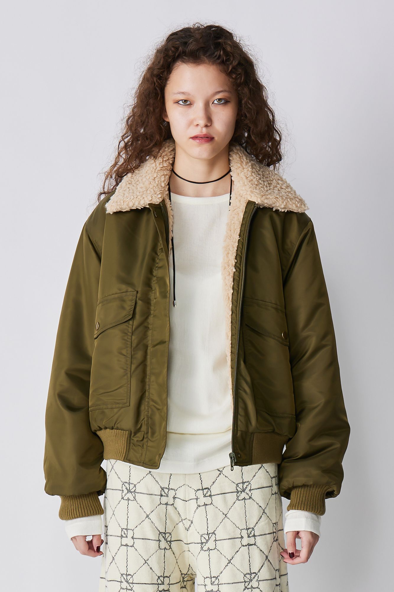アウトドブランド「WILD THINGS」とのコラボで送る、リバーシブル仕様のブルゾン。表地はナイロン生地をベースに、大きなボア襟を添えて暖かく。裏地には「MUVEIL」のスカーフ生地を使って、華やかに仕上げています。表裏を返して、ボア×スカーフを見せるのもおすすめです。