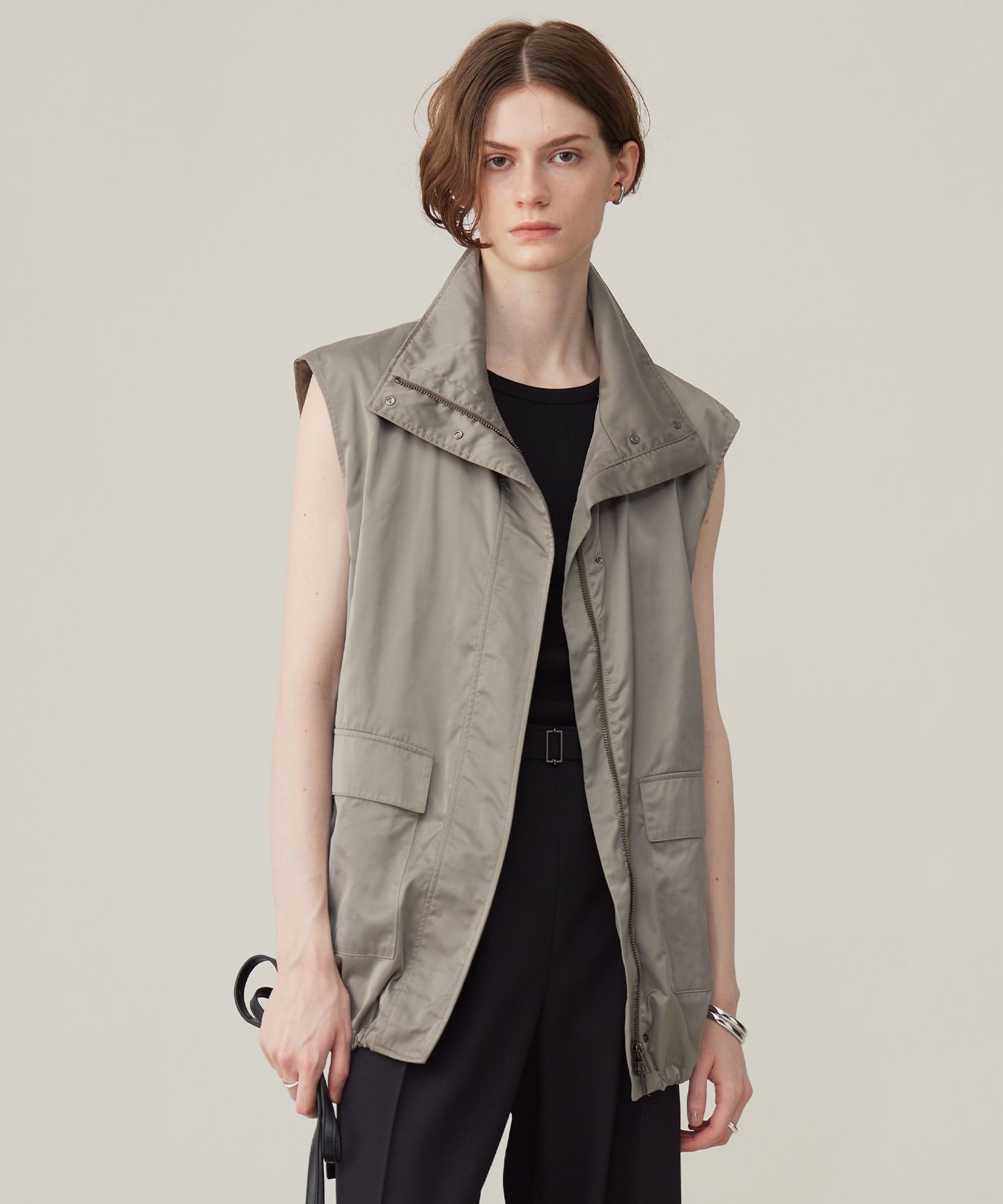 2024AW羽織るだけで今年らしさをONレザーライクでモードに決まるミリタリーベスト■デザイン羽織るだけでトレンド感のあるスタイリングが完成するスタンドカラーのミリタリーベストです。ヒップが隠れるミドル丈で、ボトムを選ばず幅広いスタイリングに合わせていただけるデザインに仕上げています。やや大きめのポケットはシンプルながら存在感がありアクセントに。裾の内側はコード付きなので、絞って丸みのあるシルエットにもアレンジが可能です。インナー次第でシーズンも長く着用いただけます。■素材レザーライクでマットな表情が特徴の高密度のサテンを使用しています。ソフトで滑らかな素材ですが、適度にハリ感があるのでシルエットがキープしやすく、仕立て映えするキレイめな素材に仕上げています。中綿にはグランウォームという身体から発生する水分を吸収し、効率よく熱に変換する吸湿発熱の不織布をしている為、薄く軽く、ソフトでありながら保温力を高める暖かさが期待できます。原料には再生ポリエステルを使用しています。※商品の取り扱い方法につきましては、タグ等に記載されている「取り扱い上の注意」「洗濯表示」をご確認ください。※採寸情報はサンプル商品のデータです。実際の商品と仕様が異なる場合がございます。※商品画像はサンプルを使用しているため、実際にお届けする商品と色味やサイズなどの仕様に変更がある場合がございます。予めご了承ください。