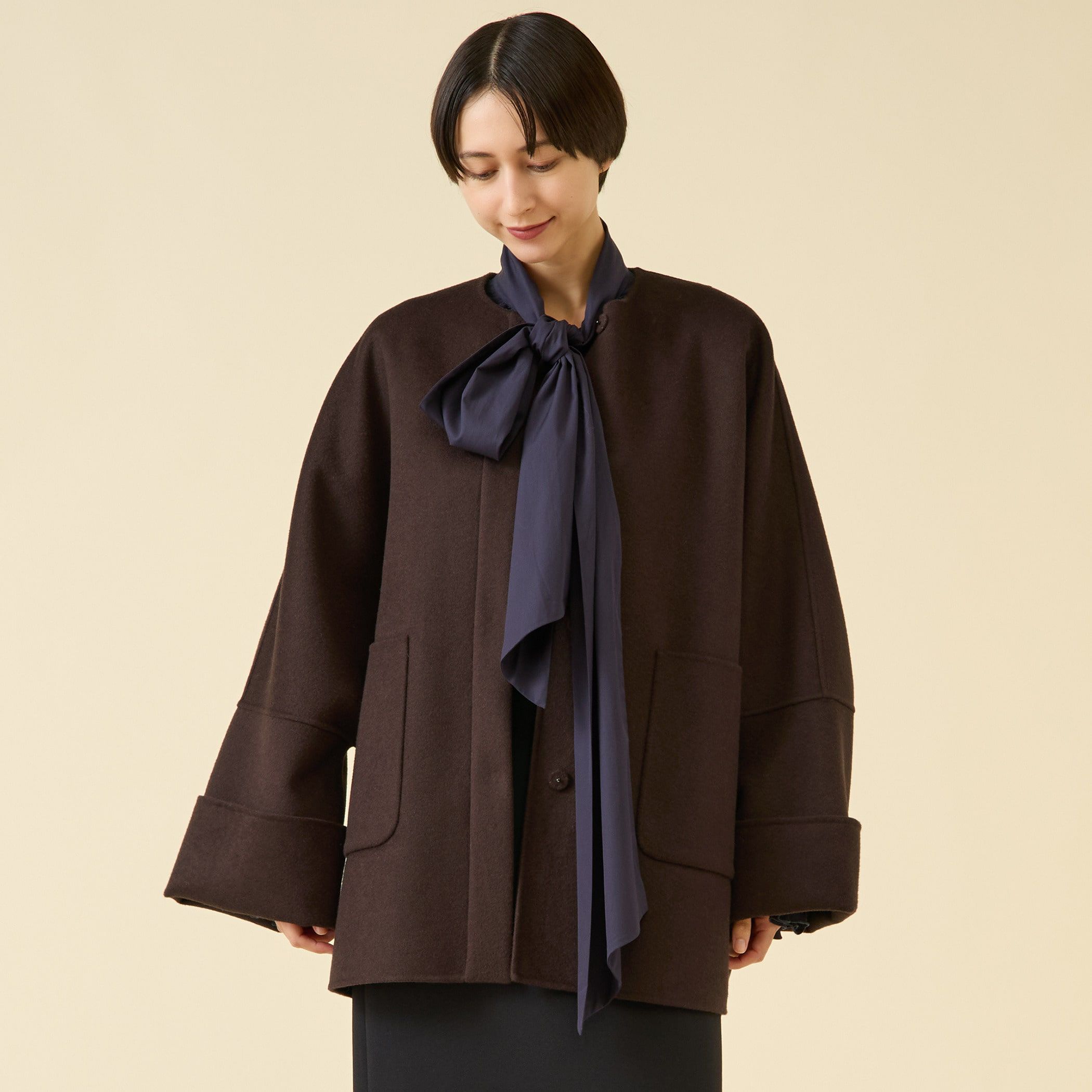 ≪デザインポイント≫スタンドカラーでテントラインシルエットが今の気分にピッタリなショート丈コートです。身頃はゆったりめなのでオーバーサイズのインナーも合わせやすいです。背抜きの裏地で軽く着用できます。≪素材・着心地≫SUPER100sのダブルクロスを使用。しっとりとした手触りが特徴で、シャルムビーバー仕上げを施すことで上品でエレガントな質感に。≪おすすめの着こなし≫コンパクトなパンツからワイドパンツまで様々なボトムと相性が良いです。透け感:なし伸縮性:なし光沢感:なし裏地:背抜き生地の厚さ:厚い