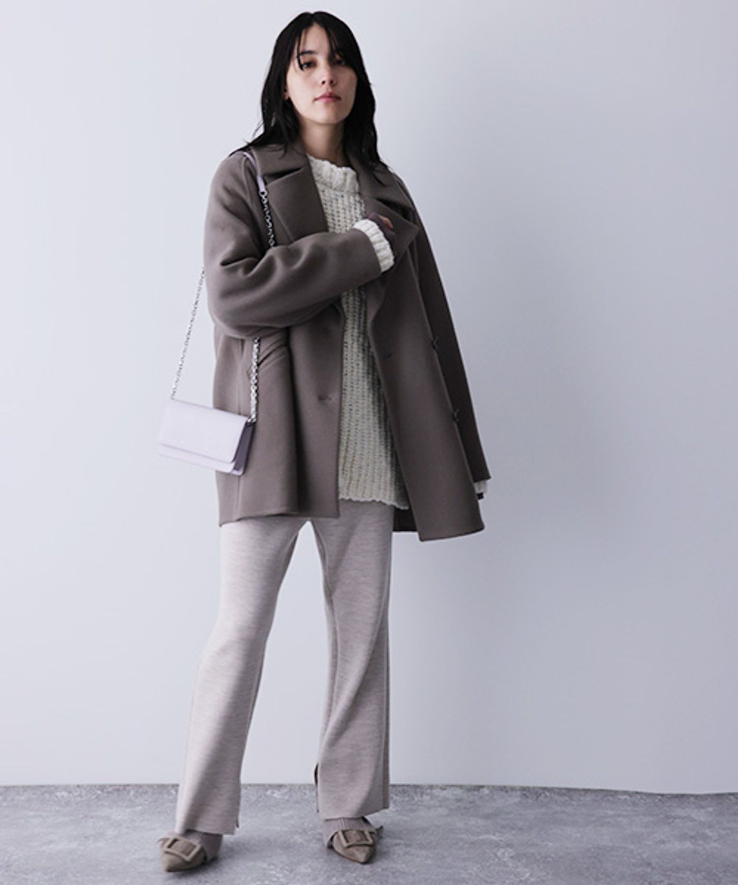 -design-ストレートなシルエットで少しだけ丈感がある新型Pコート。袖をラグランにしているので、通常のPコートよりも柔らかい印象に仕上げているのが特徴になります。今までのスーペリアシリーズよりはシルエットを少しタイトに作っているのも特徴で今までに無いシルエットを是非お楽しみ下さい◎襟はスタンドとして立たせ、チンフラップを止めたり、フロンは敢えて開けて着用するのもおすすめです!-how to care-こちらの商品はドライクリーニングをお願いしております。-fabric-国内最大の毛織物産地である尾州地区で生産されたコート生地。オーストラリアメリノウールSUPER120原料を経糸に、SUPER140原料を緯糸に 使用し織り上げています。SUPER120および140という繊細で希少性のある高原料を使用する事で、しなやかさと独特のソフトな肌触りとなります。また、生地を加工する際にシュクジュウという生地を揉み込む作業を時間をかけて行うことで、圧縮させハリコシのある生地に仕上げました。ハリコシの中に独特のソフトな質感と艶感も加わったメルトン加工に仕上げました。高原料の生地は糸が切れやすいため織りにくく、加工もシュクジュウをすると繊維が抜け落ちてしまい難しく手間を要します。それらを尾州の職人たちによって丁寧に作り上げました。【Chaos(カオス)】「カオス」の時代にあっても、自由かつインディペンデントな感性を大切にする大人の女性たちへ。素材やディティールにこだわったオリジナルと国内外で買い付けたユニークかつアーティな感覚のセレクトをミックスした発信をしています。「大人の為の上質な日常着」