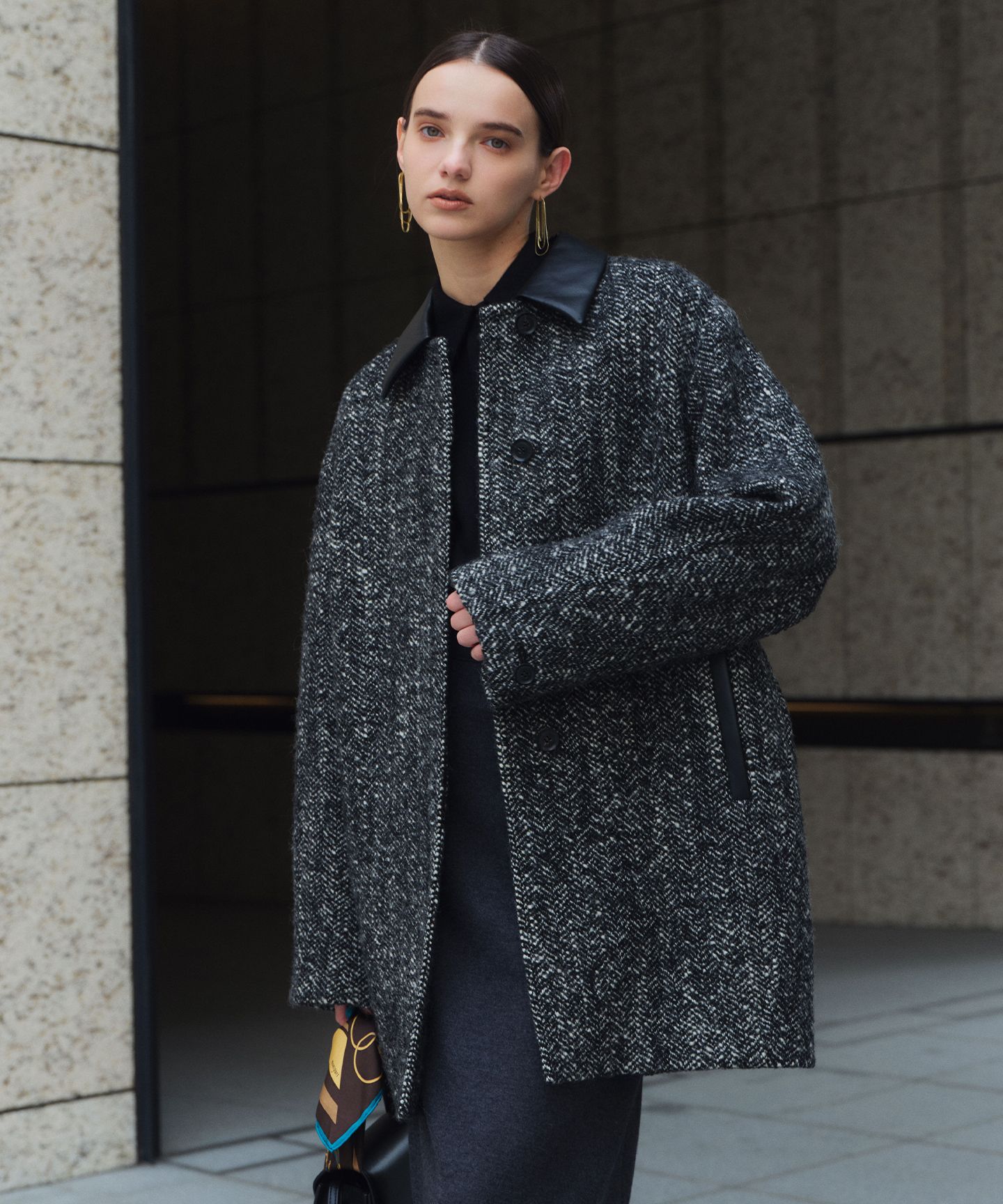 ROBY(ロビー)1点投入でぐっとリュクスな着こなしに異素材ツイードコート■デザインいつものコーディネートを格上げする、ステンカラーコートが登場。上質なツイードに襟とポケットをフェイクレザーで切り替えた異素材ミックスデザイン。柔らかな丸みを持たせた計算されたコクーンシルエットが、ボリュームがありつつも軽やかな印象を演出します。重ね着しやすいゆとりのあるラインで、ざっくりニットなどのレイヤードもしやすく、デニムでカジュアルダウンしたり、きれいめパンツと合わせてシックに着こなしたりと、幅広いアレンジに。オフィスにも馴染む上品さがありながら、カジュアルになりすぎない洗練されたデザインを感じるアウターです。■素材イタリアBALLI社のネップツイード素材。イタリアならではのインパクトのあるツイードに、フェイクレザーのツヤとハード感のメリハリが上品な素材です。※照明の関係やパソコンなどの環境により、若干製品と画像のカラーが異なる場合もございます。また商品画像はサンプルを使用しているため、実際にお届けする商品と色味や仕様の変更がある場合がございます。ご了承くださいませ。