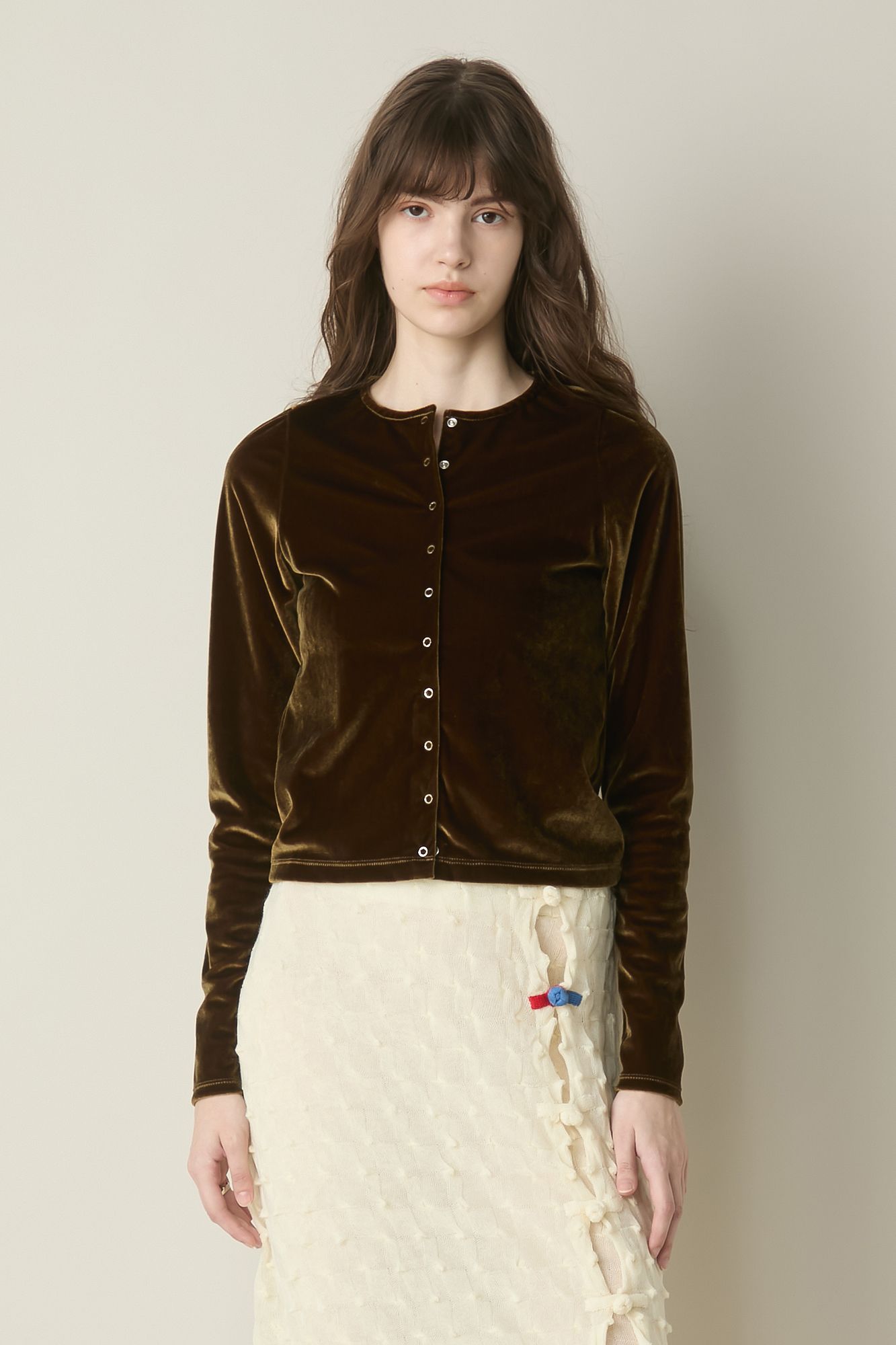 ベルベットのシックな艶めきで、女度アップ間違いなしのカーディガン。全体的に細身のシルエットと詰まり気味のネックラインで甘辛バランスも良好!着脱しやすく、アクセント使いにもなるスナップボタンもスタイリングのポイントに。