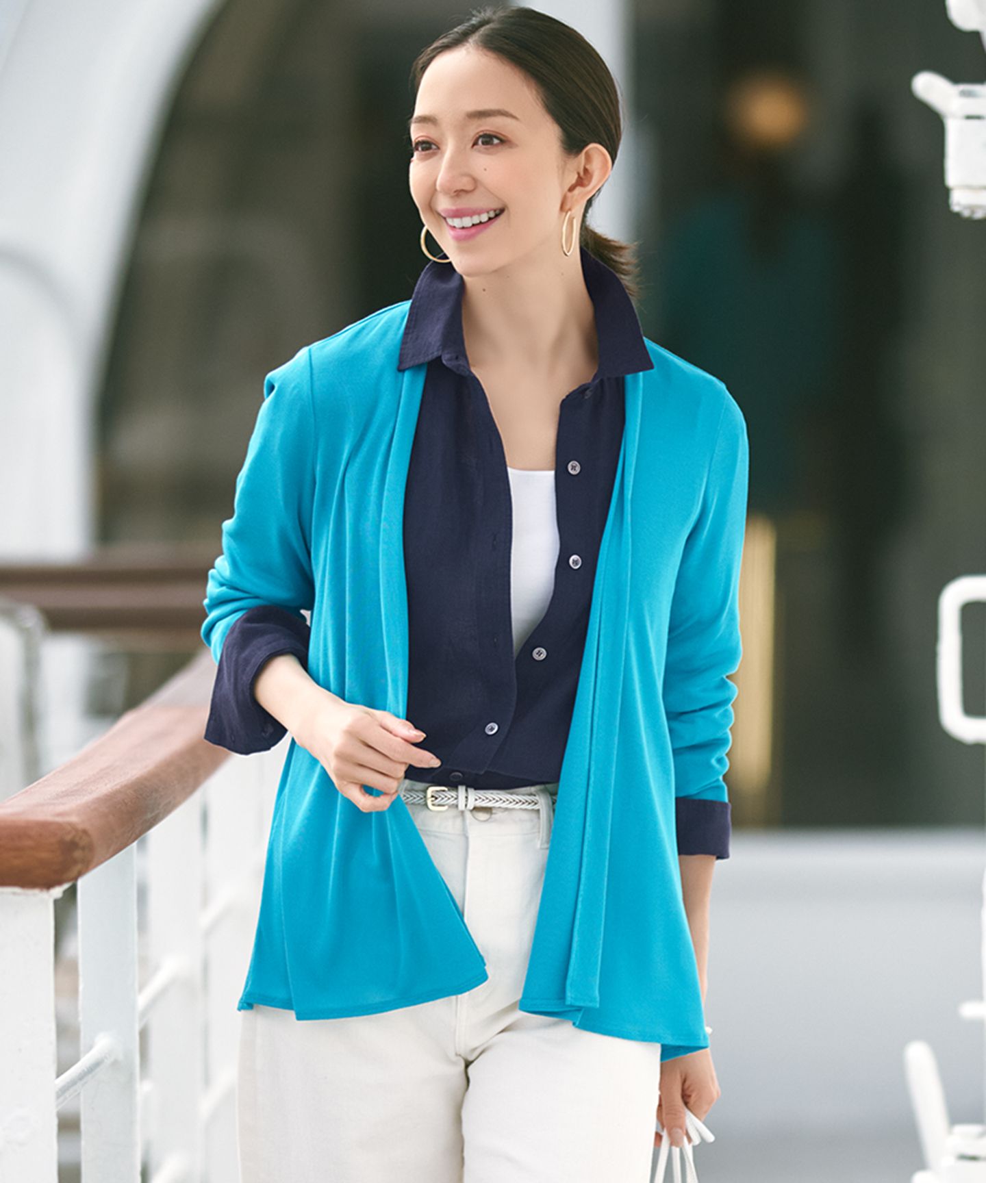 2023-2025 Spring & SummerUVケア、接触冷感を実現した高機能カーディガン!イージーケアも嬉しい大人気の1枚が今年も登場。■デザイン夏にはずせない機能を備えた23区定番のカーディガン。爽やかなドライタッチで伸びやかな着心地です。後ろ襟ぐりが高めの設計で、首すじのうっかり日焼けの防止や冷え対策にも大活躍。気になるヒップをさりげなくカバーする、長すぎない丈感も魅力です。真夏も軽やかに羽織れて、春や秋の季節の変わり目にも活躍。カラーで印象が異なるので、お色味違いでお持ちいただくのもオススメです。ベーシックなホワイト(#001)、肌なじみの良いベージュ(#033)、落ち着いた印象のライトグレー(#003)、差し色のスモーキーグリーン(#063)、洒落感のあるダークブラウン(#035)、大人な華やぎをプラスするブルー(#070)、黒に近い濃厚のネイビー(#075)、定番のブラック(#005)、新色の鮮やかなターコイズブルー(#071)・やわらかな印象のピンク(#012)の10色展開です。■素材UVケア、接触冷感を兼ね備えた機能性素材シリーズ。シャリ感をプラスして暑い夏も快適に過ごせるようにした、こだわりの日本素材です。細いレーヨンの糸にポリエステルをカバーリングし、ストレッチ性に富んだフライス編みで作られています。独特のドライタッチ感と光沢感が特徴で、キックバックも良く、着心地抜群です。シワになりにくい素材なのでバッグの中に入れて気軽に持ち運ぶことができます。通勤などデイリーから旅行まで、大活躍の羽織りです。ご家庭で手洗いできるのも嬉しいポイント。▼同シリーズマルチ機能 シアー ロング カーディガン(品番:KK23SM0536)マルチ機能 プルオーバー カットソー(品番:KKWOCM0537)マルチ機能 シアー クロップド カーディガン(品番:KKWOCM0850)※ターコイズブルー(#071)・ピンク(#012)はWEB限定カラーです。※画像はサンプルを使用している為、実際にお届けする商品と仕様が異なる場合がございます。※商品画像と実際にお届けする商品でタグのデザインが異なる場合がございます。