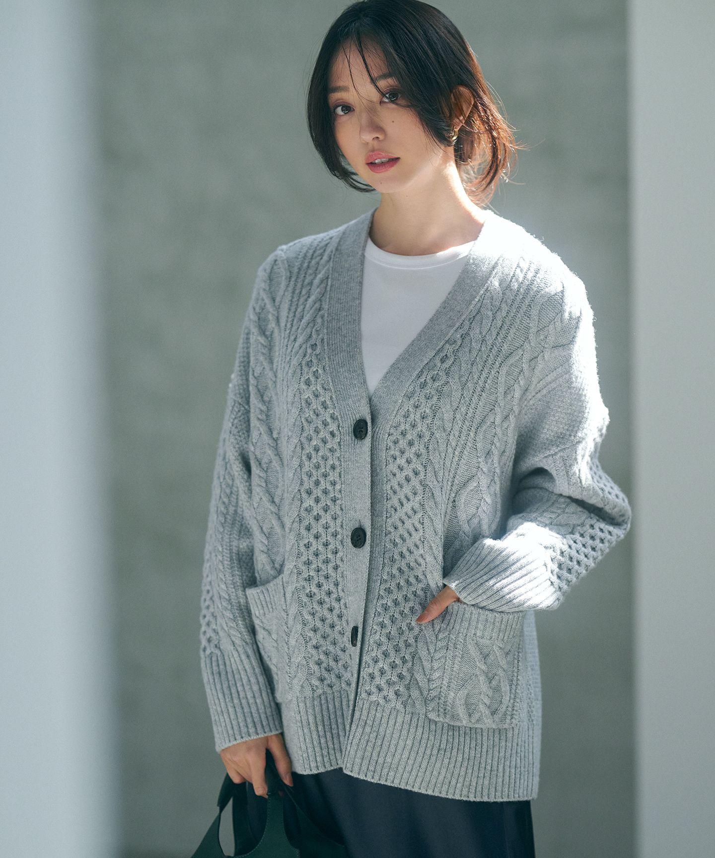 2023 Autumn & Winter大人カジュアルの代名詞、贅沢にふっくらと編み上げたアラン柄カーディガン■デザイン伝統的なアラン柄で編みたてた、Vネックカーディガンです。ふっくらと編み上げることで、軽く柔らかいバルキーカーディガンに仕上げました。ややオーバーサイズで何にでもさっと羽織れ、様々なアイテムとスタイリング可能です。秋のアウターとしても、冬の体温調整にも役立つアイテムです。同素材のニットの上に重ねる、ニットonニットのスタイリングもオススメです。ベーシックで合わせやすいホワイト(#001)、ライトグレー(#003)、WEB限定のシックなブラック(#005)、肌なじみの良いベージュ(#033)、ダルブルー(#074)の5色展開です。※ブラック(#005)は、WEB限定カラーです。■素材オーストラリア産の紡毛とカシミヤ混セミ梳毛を撚糸(撚って糸をつくること)することで、カジュアルすぎずすっきりとした風合いに仕上げた上質素材です。適度な膨らみ、バルキー性が有りながら、毛羽立ち過ぎない大人カジュアルに適した素材感が特徴です。 ※画像はサンプルを使用している為、実際にお届けする商品と仕様が異なる場合がございます。