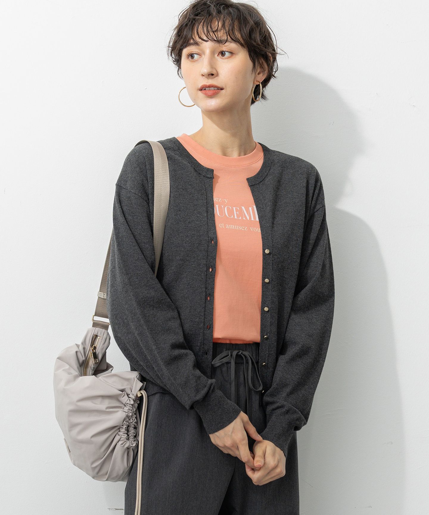 2024 Spring & Summer控え目な光沢をコーディネートのアクセントに、きれいめカーディガン■デザイン天竺編みのドルマンスリーブカーディガンです。細めの前立てですっきりとさせています。長めの袖リブにはスリット入りです。コンパクトな丈感で、前をとめてプルオーバー風に着用していただくのもお勧めです。カラーは、ニュアンスのあるライトグレー(#003)、ほど良い光沢のゴールド(#090)、肌なじみの良いブラウン(#030)、着合わせしやすいブラック(#005)、さらに新色でWEB限定カラーのネイビー(#075)の5色展開です。■素材繊細な透け感と、微光沢のあるニュアンスカラーが特徴の人気素材です。さらりとした肌触りで着心地がよく通気性、吸湿性にも優れ抗ピリング性も◎。ナチュラルな光沢がカジュアルからきれいめまで、幅広くマッチする素材感です。たたんでも軽くコンパクトに収まるので、旅行や持ち運びにも重宝します。▼同シリーズシャイニーシアー ニット(品番:KRWOCM0551)シャイニーシアー ニット ロングカーディガン(品番:KRWOCM0553)※画像はサンプルを使用している為、実際にお届けする商品と仕様が異なる場合がございます。