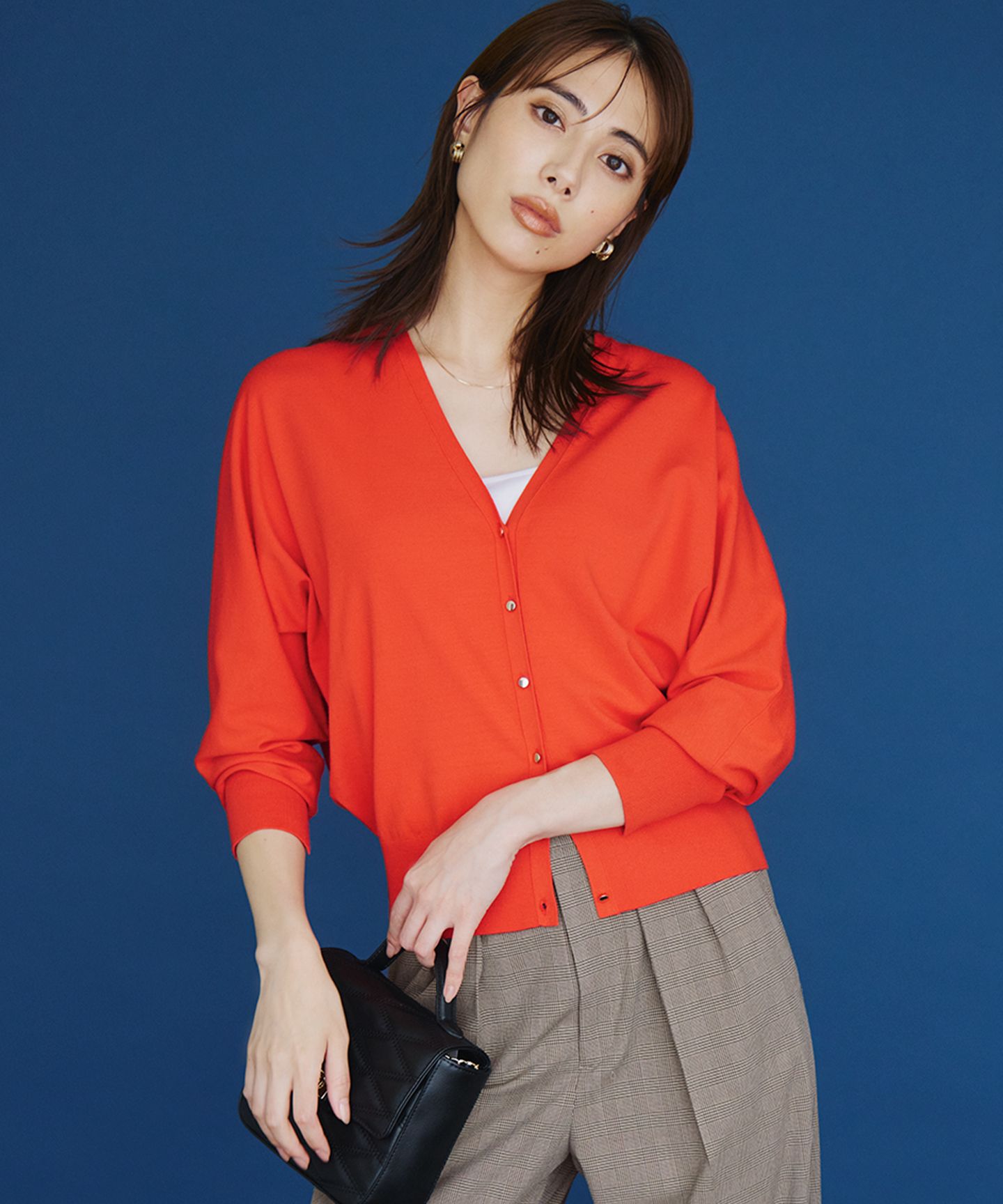 2026 Pre Spring胸もとのポケットと同色ボタンが洒落感をプラス■デザイン二重に編み立てることで、程よくしっかりとした厚みと美しいシルエットを保つニットカーディガンです。なめらかな肌触りの上質素材は、オンオフ問わず幅広いシーンで活躍する汎用性の高さが魅力。胸元のポケットがさりげないアクセントとなり、それぞれのカラーに合わせて染め上げたボタンが、全体をシックにまとめ、上品な印象を与えます。 一枚でプルオーバーのように着こなしたり、ワンピースやブラウスの上に軽く羽織ったりと、様々なスタイリングをお楽しみいただけます。きれいめパンツと合わせてオフィススタイルに、デニムやワイドパンツと合わせて大人のカジュアルスタイルにと、着回し力も抜群です。 カラーは、顔周りを明るく見せる優しい印象のライトイエロー(#042)、どんな色とも合わせやすい上品で柔らかなアイボリー(#002)、コーディネートの主役になる鮮やかで華やかなレッド(#010)、爽やかで清潔感のある澄んだ空のようなスカイブルー(#072)、知的で落ち着いた印象を与える深みのあるネイビー(#075)、気分をリフレッシュさせる軽やかで優しいライトグリーン(#062)の6色展開です。■素材きめ細やかな綿と、肌触りの良いカシミヤをブレンドした混紡糸を使用しています。綿の持つ美しい発色と自然な微光沢に、カシミヤならではのなめらかでリッチな風合いが加わり、季節の変わり目にぴったりの心地よさを実現しました。軽やかな着心地ながらも、上品な光沢感と柔らかな肌触りで、大人の女性にふさわしい上質感を演出します。※画像はサンプルを使用している為、実際にお届けする商品と仕様が異なる場合がございます。