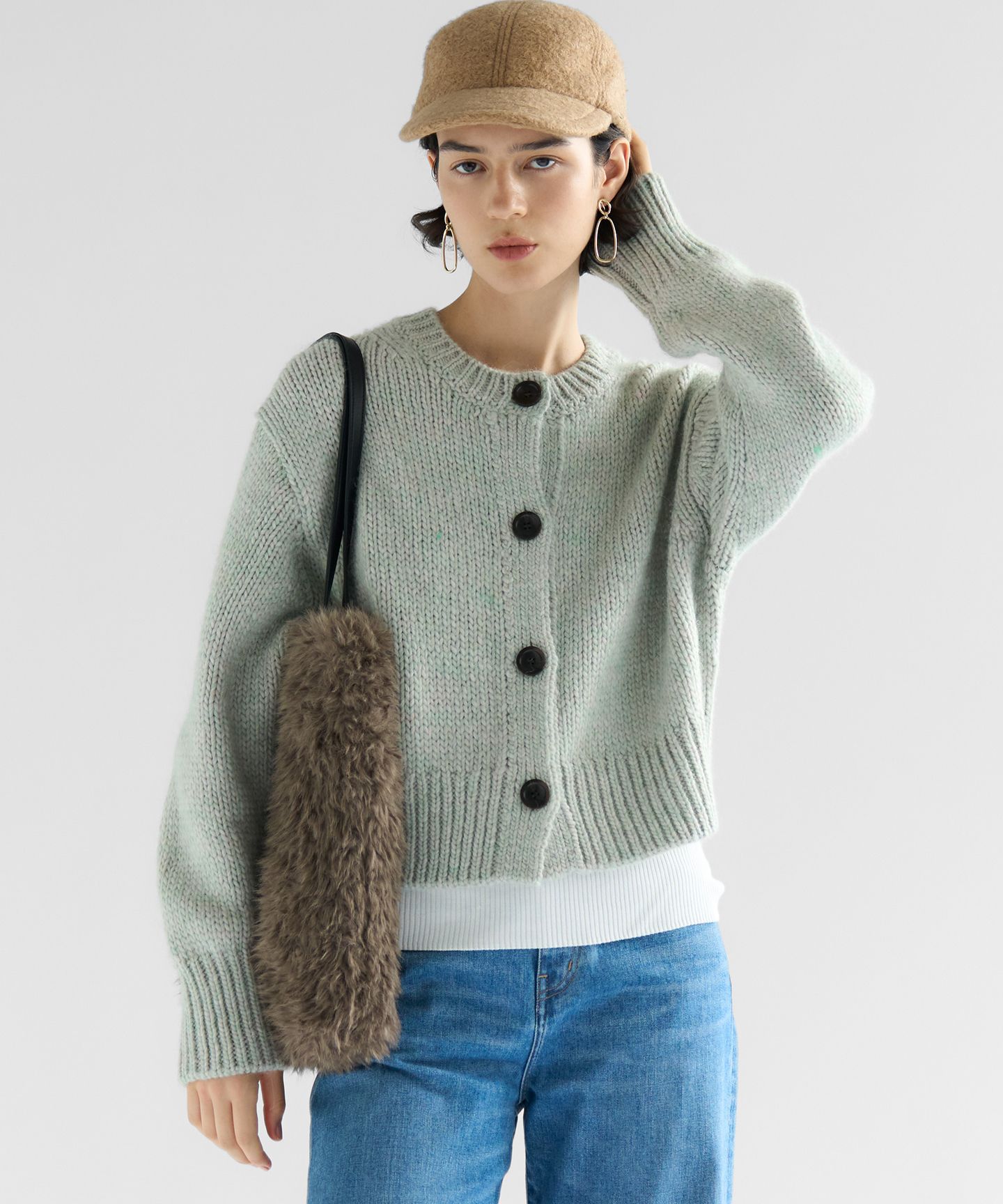 2025 Autumn & Winterマーブルカラーがニュアンス感のある旬顔カーディガン■デザインインポート糸ならではの、表情豊かなマーブルカラーが魅力のクルーネックカーディガン。ふっくらとしたバルキー素材で、手編みのような温かみのある風合いと、存在感のある大きめのボタンがデザインのアクセントになっています。コンパクトな丈感で、ワイドパンツやフレアスカートなどボリュームのあるボトムスともバランス良く決まります。上部のボタンを開けてプルオーバーのように着こなせば、また違った表情をお楽しみいただけます。一枚で主役になるデザインなので、シンプルなインナーに羽織るだけで洗練されたスタイルが完成。カラーは、顔回りを明るく見せるコーラルミックス(#520)、抜け感のあるミントミックス(#563)の2色展開です。■素材イタリアPINORI社の糸を使用しています。南米産のふっくらとしたウールをベースに、アクリルとアルパカをブレンドすることで、軽やかで暖かな着心地を実現しました。複数の色を混ぜ合わせることで、奥行きのある杢調のマーブルカラーに仕上げています。手編みのようなざっくりとした見た目ながら、スポンジのような柔らかく弾力のある風合いが特徴です。※画像はサンプルを使用している為、実際にお届けする商品と仕様が異なる場合がございます。