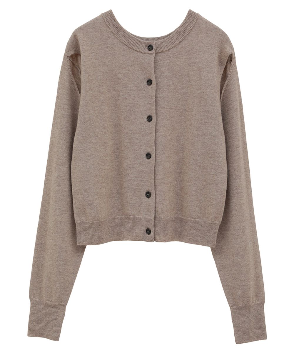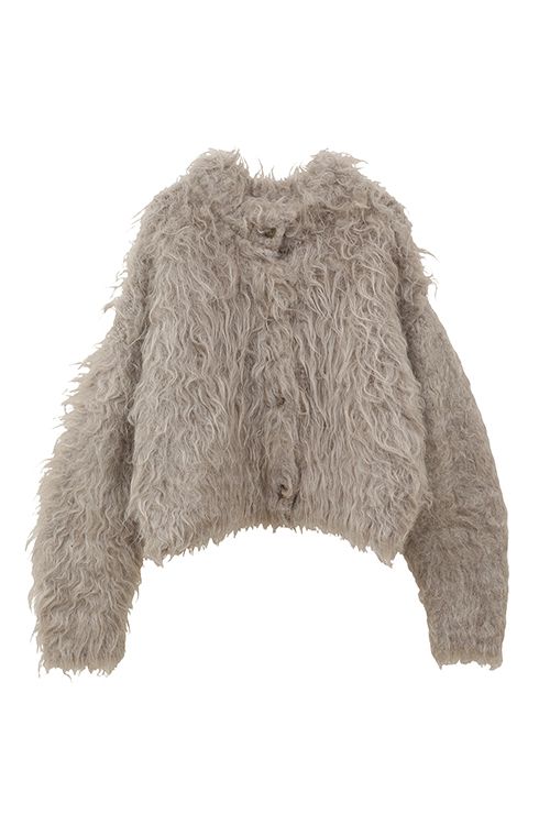 ループの大きなブークレ糸を掻いて毛を出し、より毛足の長さとふくらみ感を表現しました。軽くて柔らかい着心地とヘアリーな雰囲気に仕上がるように特殊な加工をしています。袖は、丸みのある構築的なCLANEらしいフォルムに仕上げました。ショート丈なので、ボトムを選ばずにスタイリングがしやすく、低身長の方もバランスが取りやすいカーディガンです。