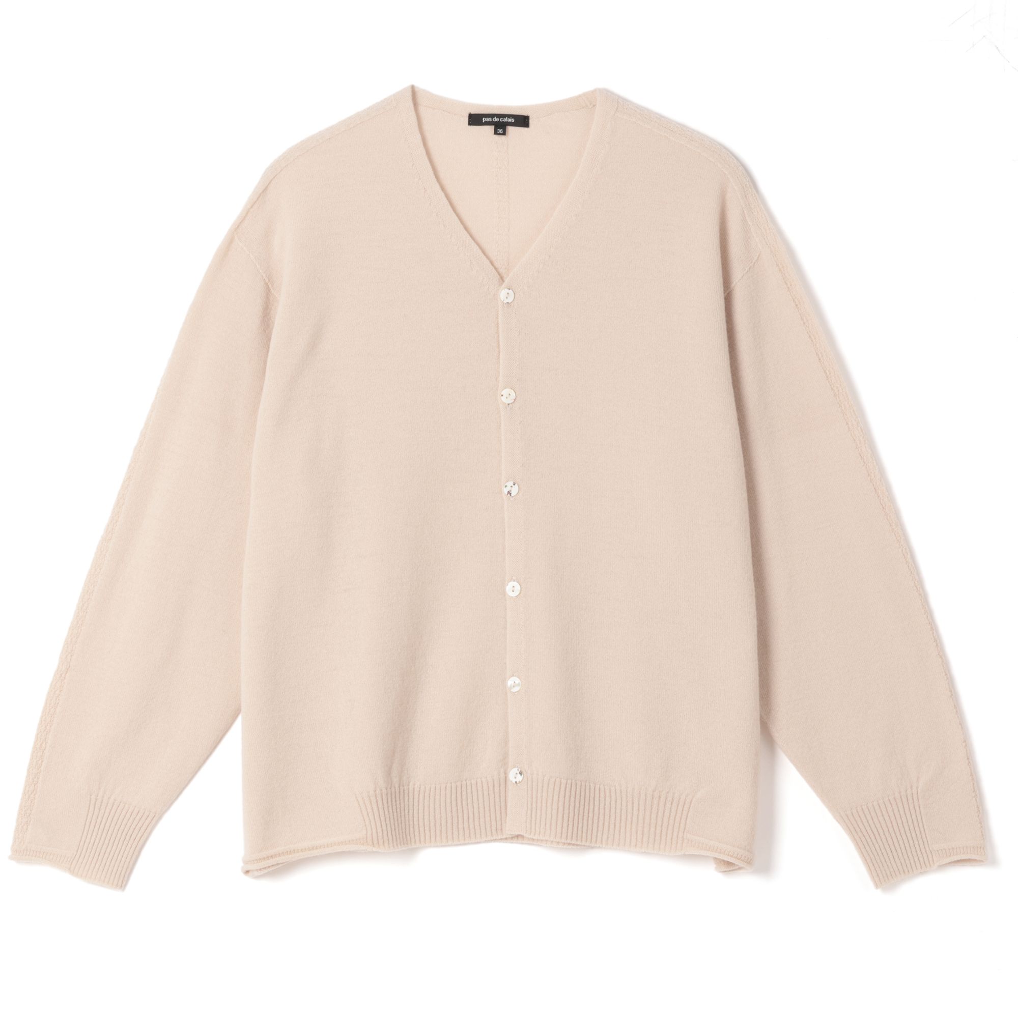 やや前上がりのパターンで、着れば自然な立体感を生むVネックカーディガン。ショート丈なのでレイヤード映えもしやすく、立体感のある柄編みがシンプルをアップデート。オーストラリア産メリノ種のファインラムを厳選し、カシミアと紡毛紡績することでふっくらと優しいぬくもりを実現しています。