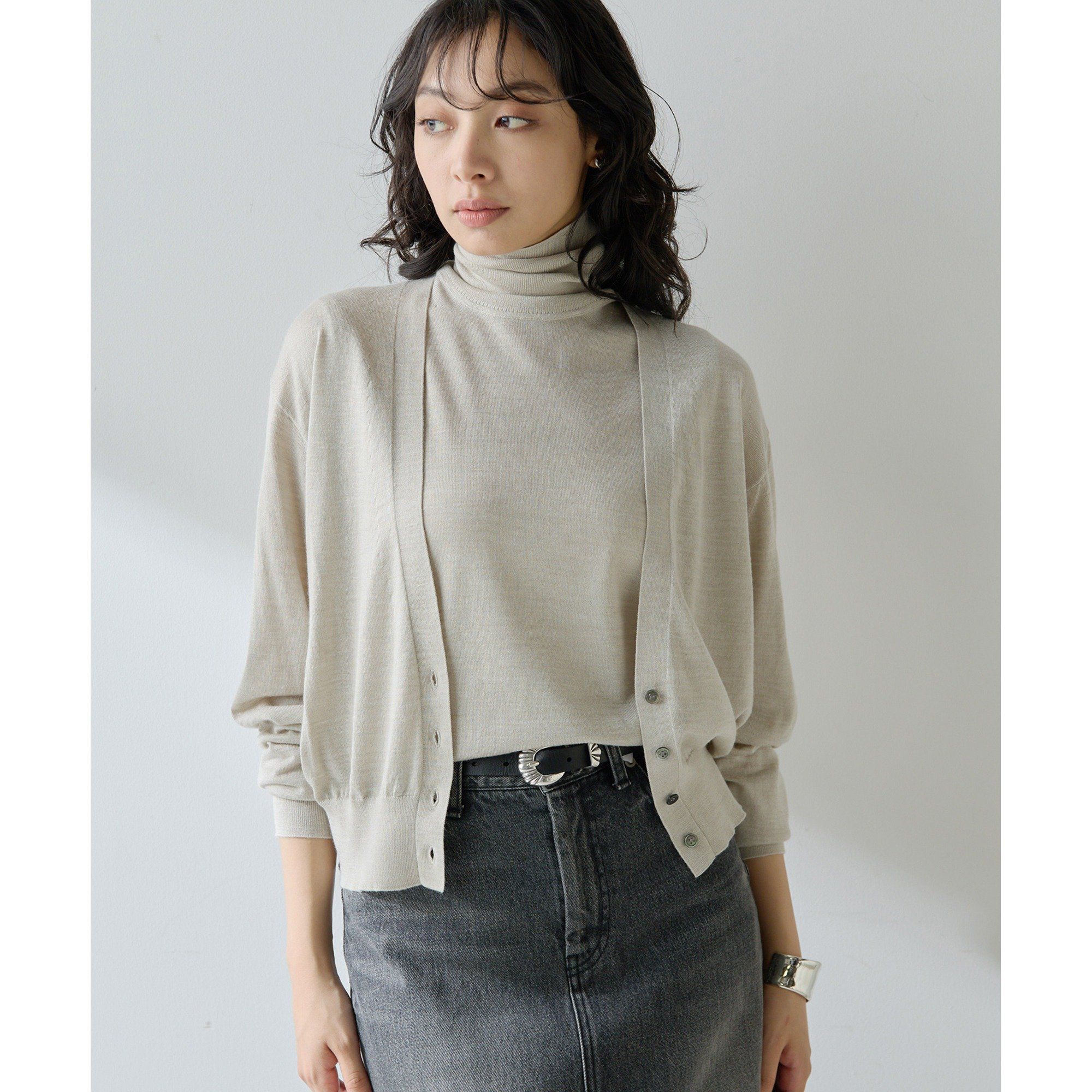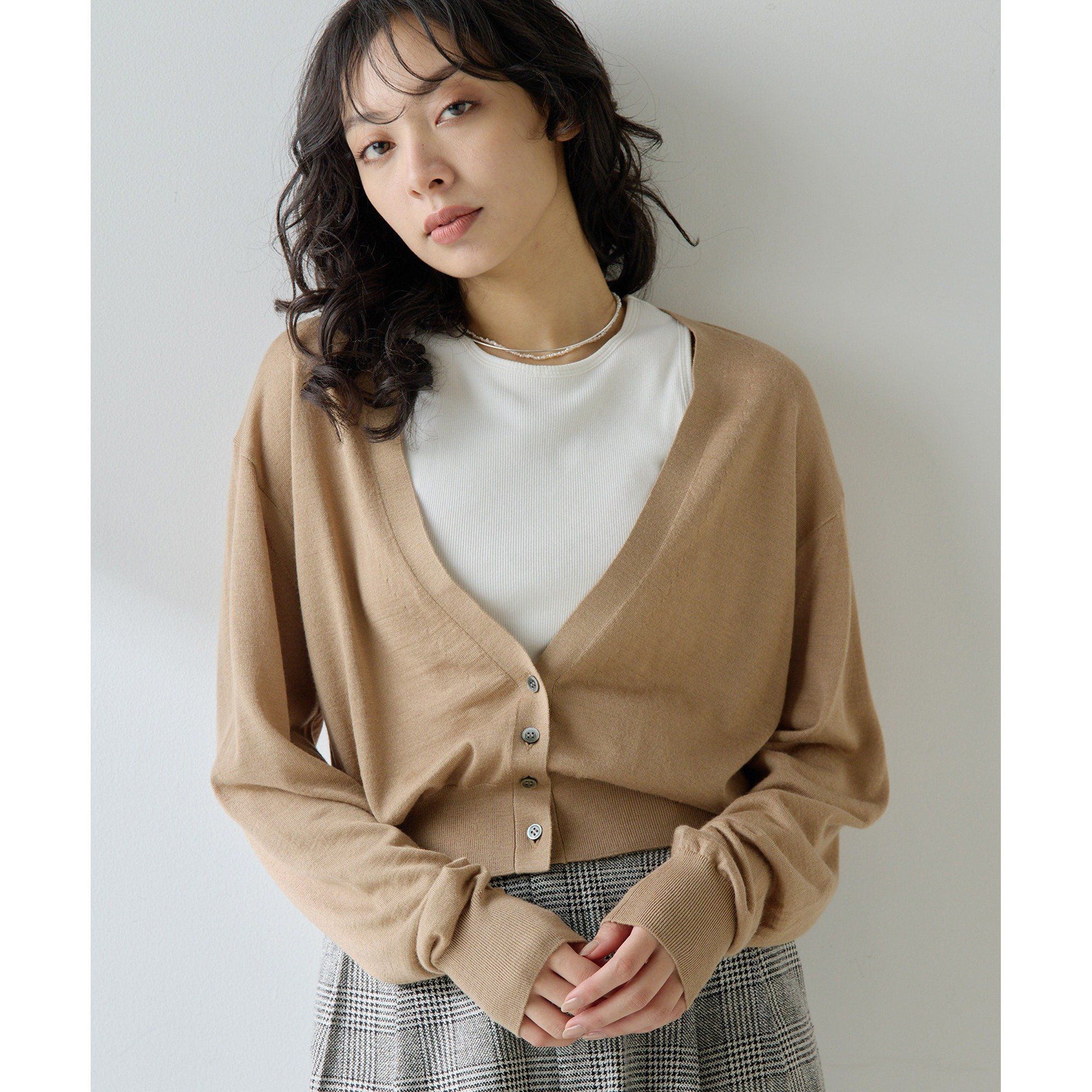 【2025AW】洗練されたムードに導く、大人のニットカーディガン■ざっくりとした深めの開きがポイントのVネックカーディガン。■ハイゲージ編みのさらっとした着心地が魅力。■小さめのボタンが上品な印象を与えつつ、さりげないアクセントをプラス。■カットソーやシャツの上に羽織るのはもちろん、ベアトップ合わせでボタンを閉じてもサマになり、ロングシーズン活躍できる一枚。■同素材の16G タートルノースリーブプルオーバー(ブランド品番:WGZ1052105A0006)とのアンサンブルもおすすめ。【COLOR】ライトベージュ:大人っぽく上品さのあるライトベージュ。キャメル:肌馴染みの良い明るめのキャメル。【MATERIAL】ウール100%に比べ、より滑らかで若干のドレープ性と綺麗で艶のある光沢をもつ、ウールとレーヨンの混紡糸。----------------------------------------------------洗濯方法:手洗い可透け感:ややあり裏地:なし伸縮性:あり光沢感:なし----------------------------------------------------【注意事項】・画像の商品はサンプルです。実際の商品と仕様、加工が若干異なる場合があります。また 、パソコンやスマートフォンのモニター環境などにより、色味が違って見える場合がございます。・店頭及び屋外での撮影画像は、光の当たり具合で色味が違って見える場合があります。商品の色味は、スタジオ撮影の画像をご参照ください。・入荷状況により、お届け予定が前後する場合があります。・お客様への発送が店頭販売より遅れる場合があります。・追加生産商品は、一部の店舗、通販で販売中の場合があります。予めご了承下さい。