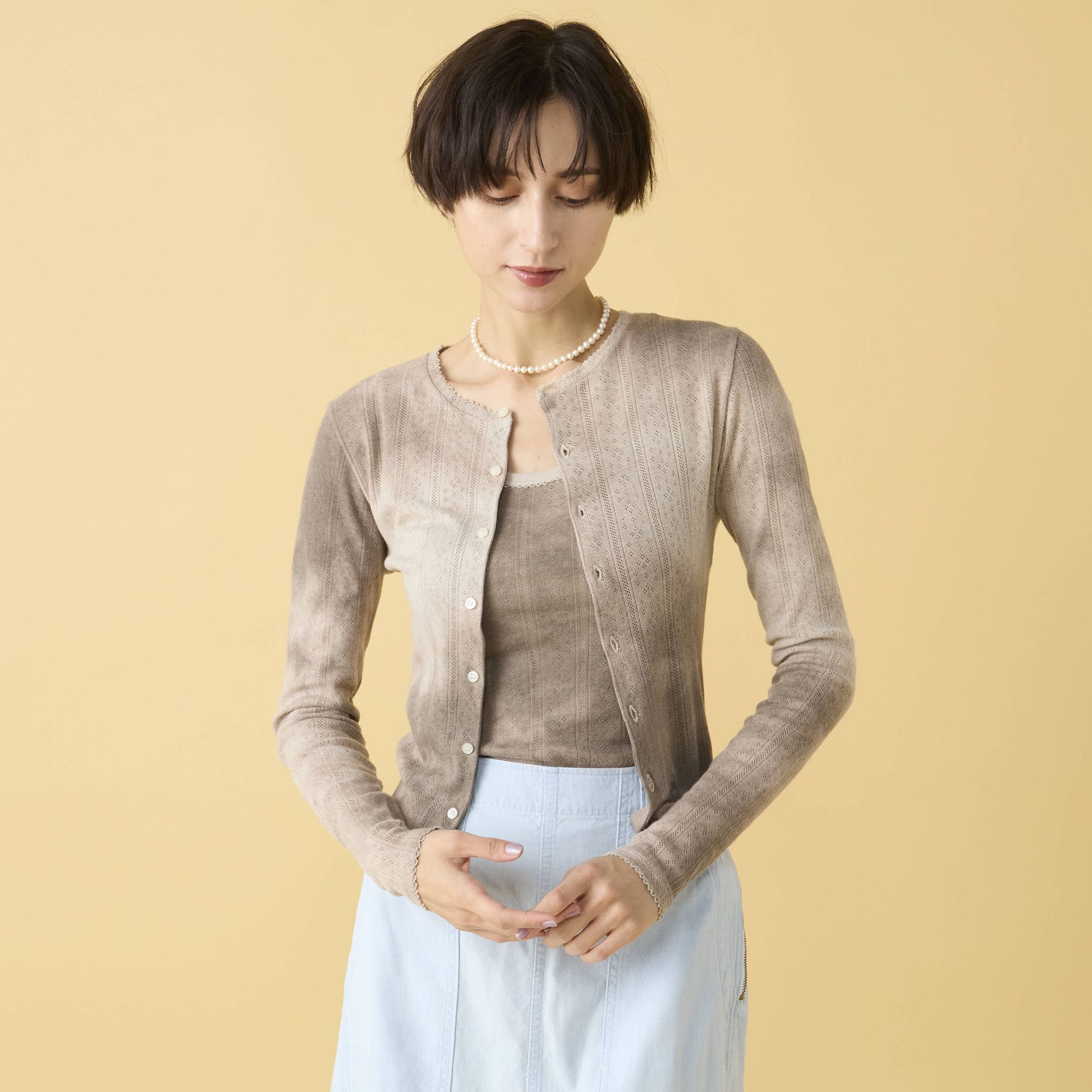 ほどよくフィットするコンパクトなカーディガン。衿ぐりと袖口のピコ刺繍があどけなさとシックさを引き出し、ガーリーな魅力に。透け感あるパターンメッシュに京都の染工場で施したムラ染めが奥行きを生む。ウール×コットンの柔らかな混紡素材。