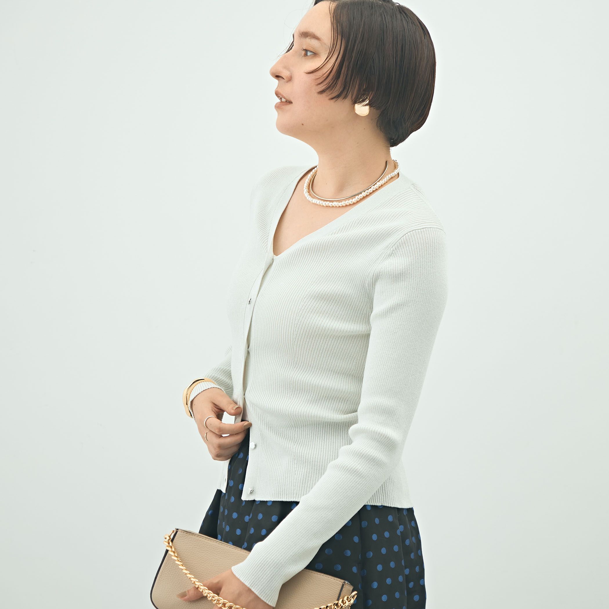 ◇25AW◇NOLLEYS◆Point・リヨセル素材にストレッチ糸をプレーティングしたすっきり大人Vネックカーディガン・天然由来の再生繊維で地球にやさしいリヨセル素材を使用・滑らかで光沢があり肌触りが良いのが特徴・吸湿性◎で蒸れにくく、色もキレイ・ラメを撚糸してもちくちくせず柔らかいのも魅力・前身頃のさりげないリブの寄せ目がデザインポイント・コンパクトンなサイズ感で、1枚着としても活躍・同シリーズのプルオーバーニット(5-0035-5-02-016)もあり●お取扱い上のご注意●末永くご愛用頂くために、アテンションタグを必ずご確認の上、着用又はお取り扱い下さい。気になる商品は、お気に入り登録がオススメです!クーポン情報、入荷情報が、通知されるようになります。※店頭及び屋外での撮影画像は、光の当たり具合で色味が違って見える場合があります。商品の色味は、スタジオ撮影の画像をご参照下さい。※商品画像に関しては出来る限り忠実に表示出来るよう努めておりますが、お客様がご利用のモニターの設定及び特性により、実際の商品と比較し色味に若干の誤差が生じる場合があります。※画像の商品はサンプルとなりますので実際の商品と仕様、加工、サイズが若干異なる場合がございます。