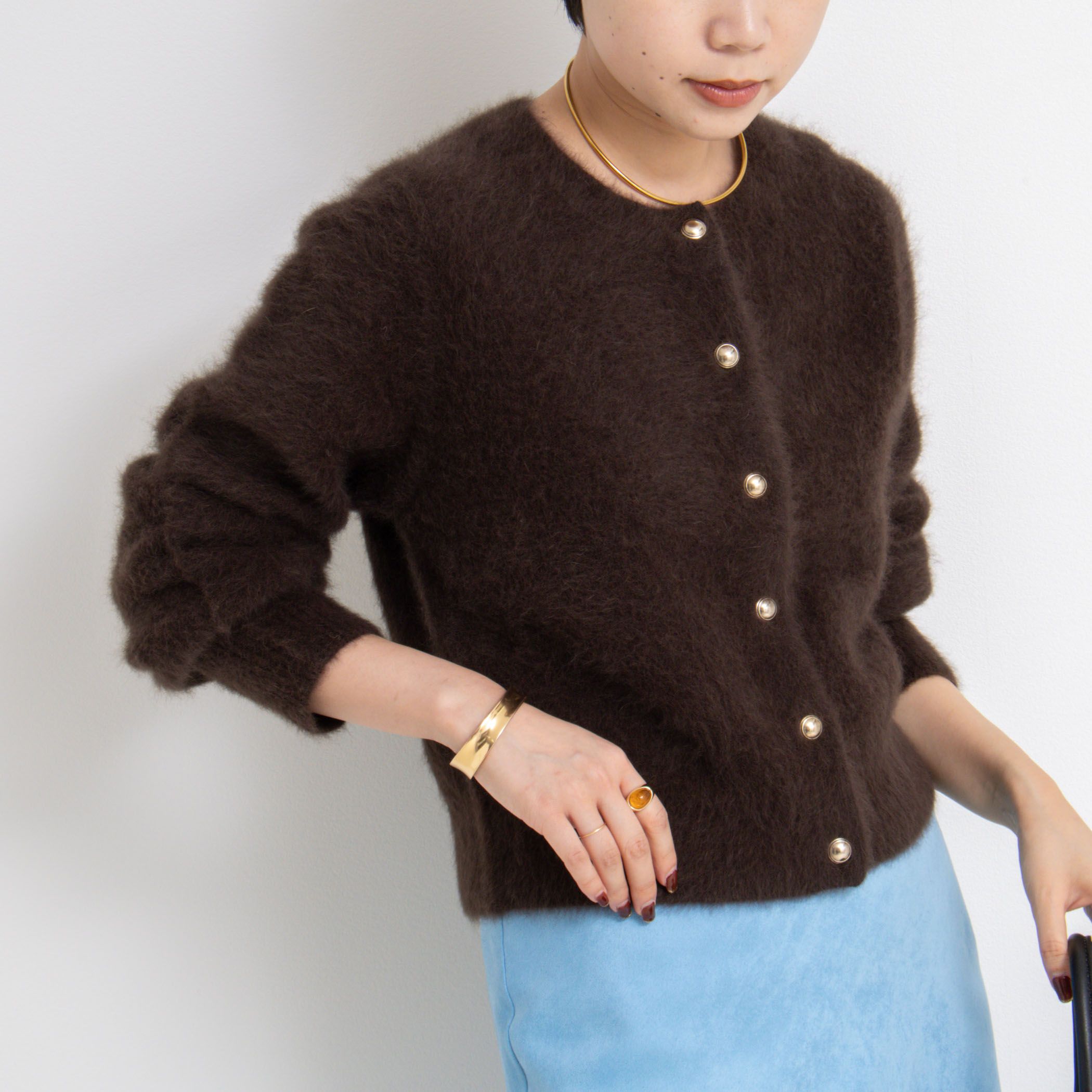 ◇25AW◇NOLLEY'S sophi◆Point・着丈短めのベーシックなクルーネックカーディガン・ウールとフォックス、太番手のポリエステル糸を使用し、蜜に編み上げながらフワッとした風合い・今年はメタル釦がアクセント・着丈も長過ぎず、裾は程よくリブで止まるので、スカートでもパンツでも合わせやすい一枚・同素材の2WAYプルオーバー(5-0030-6-02-001)あり●お取扱い上のご注意●末永くご愛用頂くために、アテンションタグを必ずご確認の上、着用又はお取り扱い下さい。気になる商品は、お気に入り登録がオススメです!クーポン情報、入荷情報が、通知されるようになります。※店頭及び屋外での撮影画像は、光の当たり具合で色味が違って見える場合があります。商品の色味は、スタジオ撮影の画像をご参照下さい。※商品画像に関しては出来る限り忠実に表示出来るよう努めておりますが、お客様がご利用のモニターの設定及び特性により、実際の商品と比較し色味に若干の誤差が生じる場合があります。※画像の商品はサンプルとなりますので実際の商品と仕様、加工、サイズが若干異なる場合がございます。