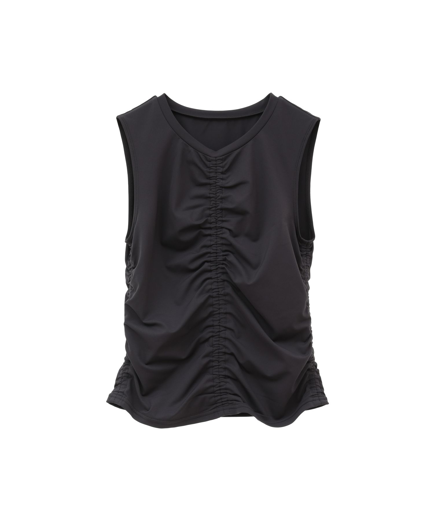 たっぷりギャザーを寄せた立体的なカットが魅力のタンクトップです。昨シーズンまでの素材より、よりしっかりとした生地を使用することで、伸びや洗濯にも強くなっています。環境に優しいエコ素材でありながら、UVカット性・吸汗速乾性があるので、ラッシュガードとして水際シーンにも大活躍します。同素材のフレアパンツと合わせたセットアップスタイルがおすすめです。・リサイクルポリエステル85%使用・吸汗速乾・ラッシュガード・ホットヨガ対応・UVカット[UPF50+]・4WAYストレッチ素材・洗濯してもシワになりにくいイージーケアアイテム・同素材ボトムスあり※商品下げ札のQRコードを読み取って頂くと、 『ジュリエのエコの取り組み』をご紹介したページをご覧いただけます。-------------------------透け感 :なし伸縮性 :あり生地の厚さ :普通-------------------------