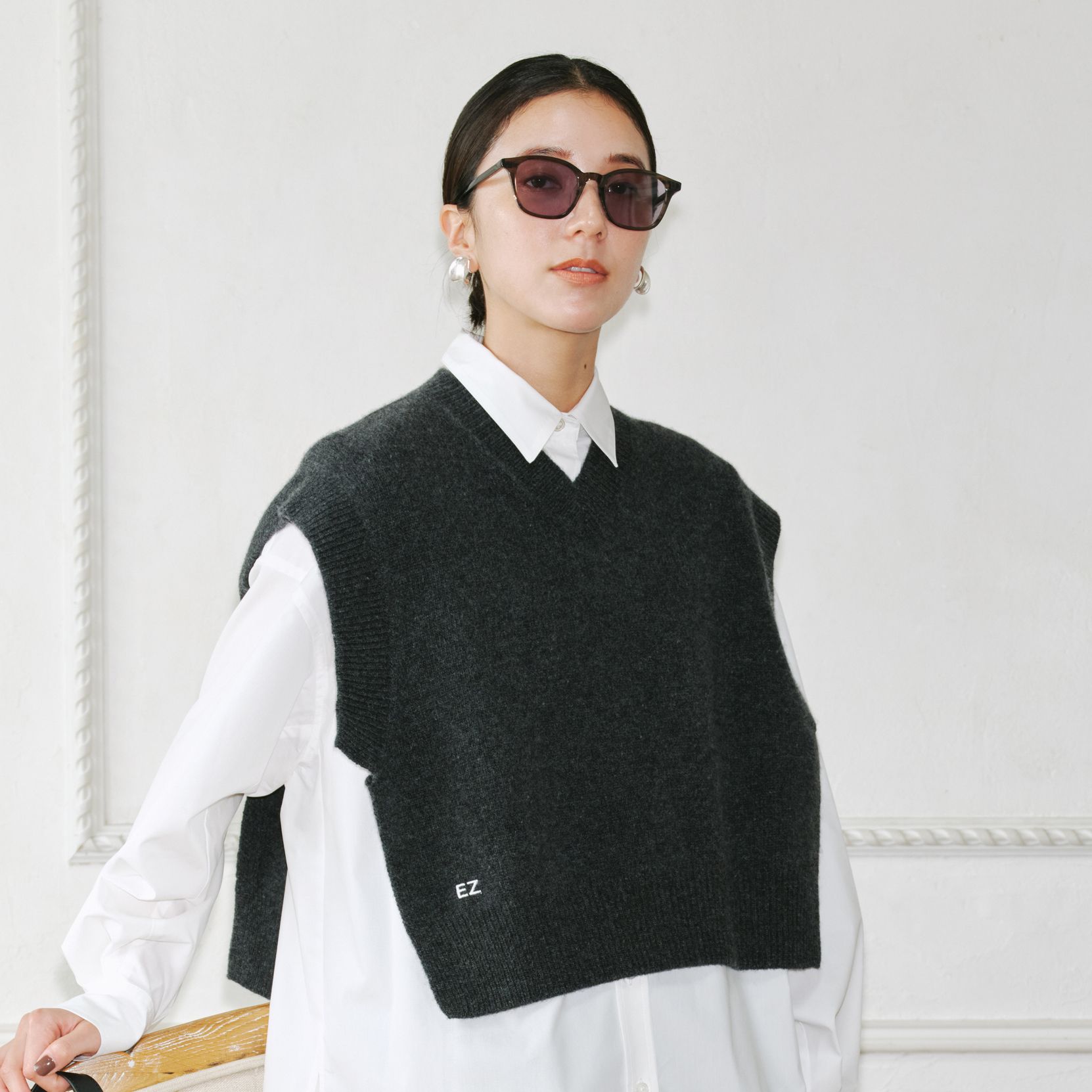 シャツやジャケットの上に重ねてアクセサリーのように楽しめるベストは、浅いVネックが着こなしの鮮度を瞬時にアップ。前後差のあるレングスとフルオープンのサイドデザインもポイント。デザイン性だけでなく、最高級ウルトラファインメリノウールの柔らかいタッチも魅力。2シーズン目となるスタイリスト飯島朋子さんとのコラボItem。右裾にはEZの刺繍を施しました。