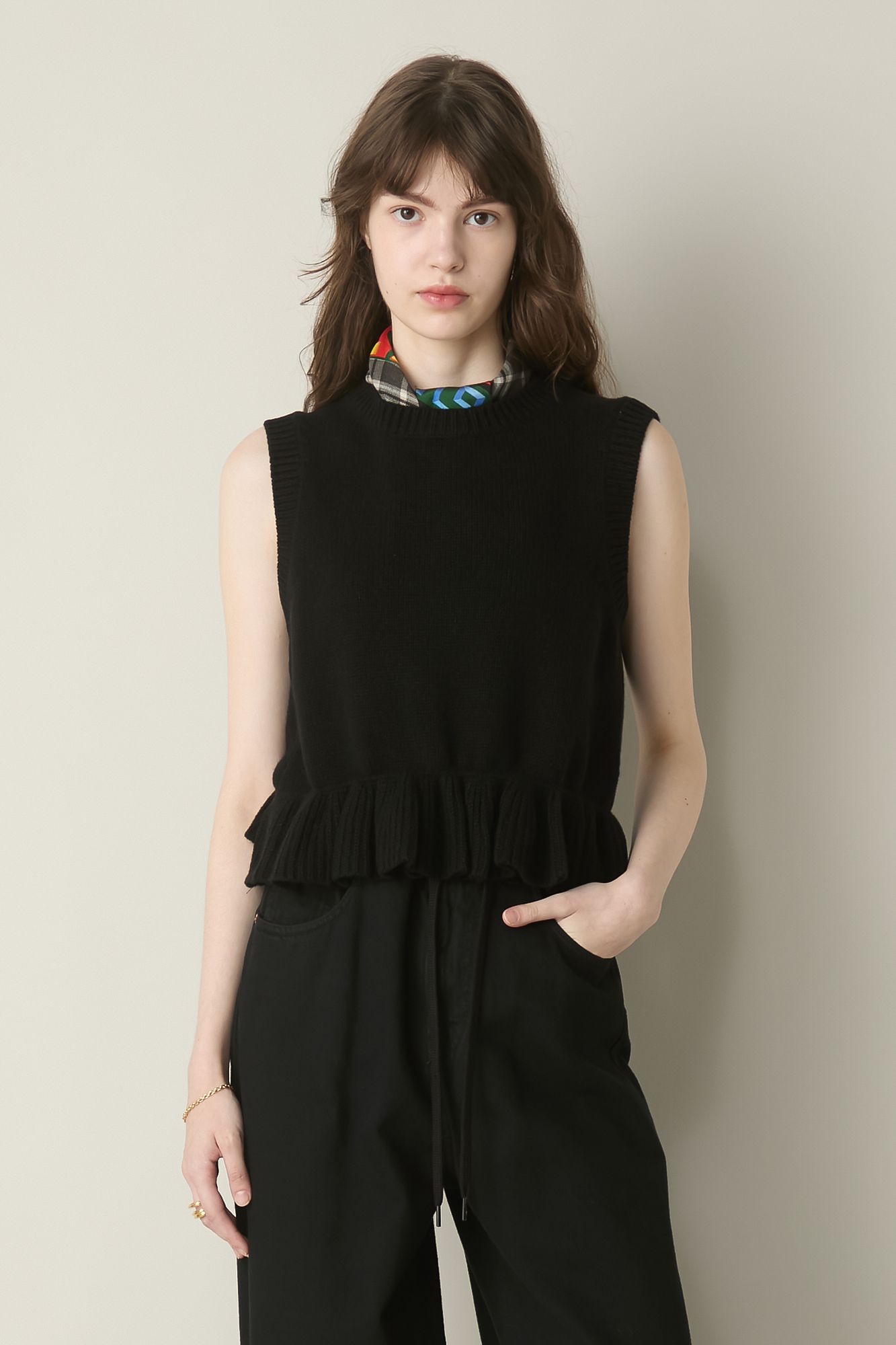 クロップド丈で扱いやすい、リサイクルカシミアのベスト。ペプラムシルエットやバックを飾るフラワーボタンが着こなしにリズムを与え、今っぽさ満点。大きく開いたアームホールで窮屈感もなく、レイヤード映えも確実です。