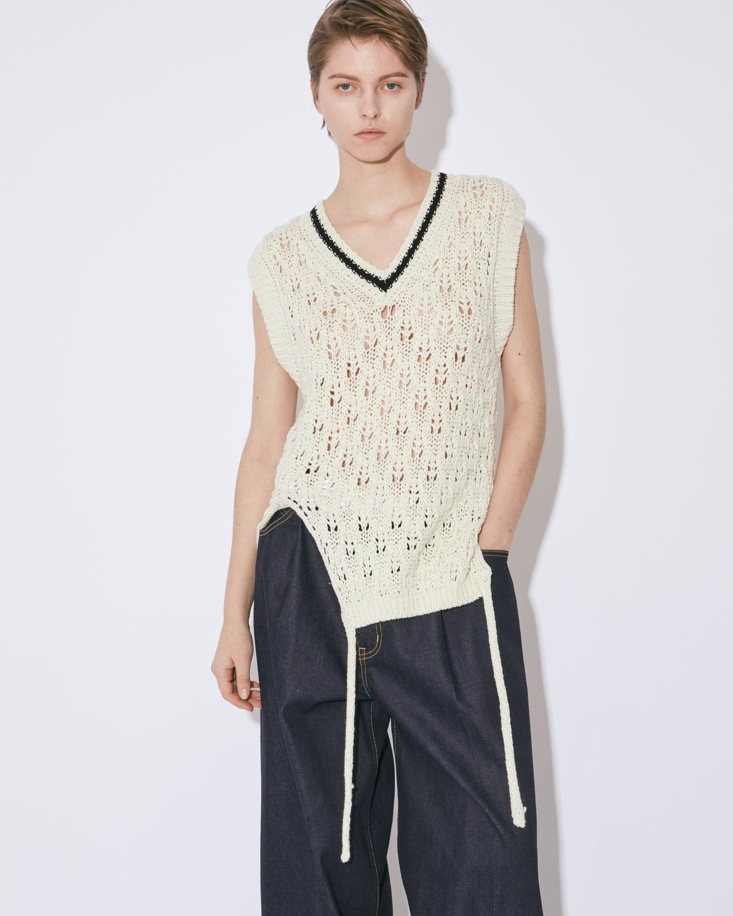 シンプルでありながら、深めのスクエアネックがひとさじの個性を感じさせるベスト。着用時のシルエットにも惚れぼれし、前後2WAYで楽しめるのもうれしい。ほのかな透け感を活かしたヌーディーな着こなしが旬ムードに導きます。