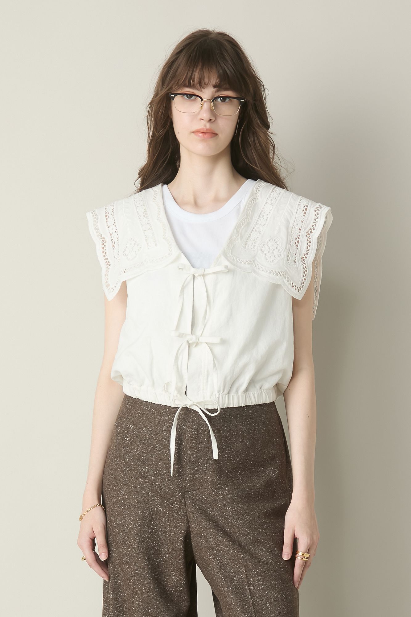 セーラーカラーに「SEA」の文字をアイレット刺繍で繊細に表現したマリン風のベスト。裾はドローコードで調整もでき、投入するだけで一気に更新感をプラス。レイヤードしやすいコンパクト丈やアクセント使いにもなるフロントリボンも小粋な愛らしさを添えています。