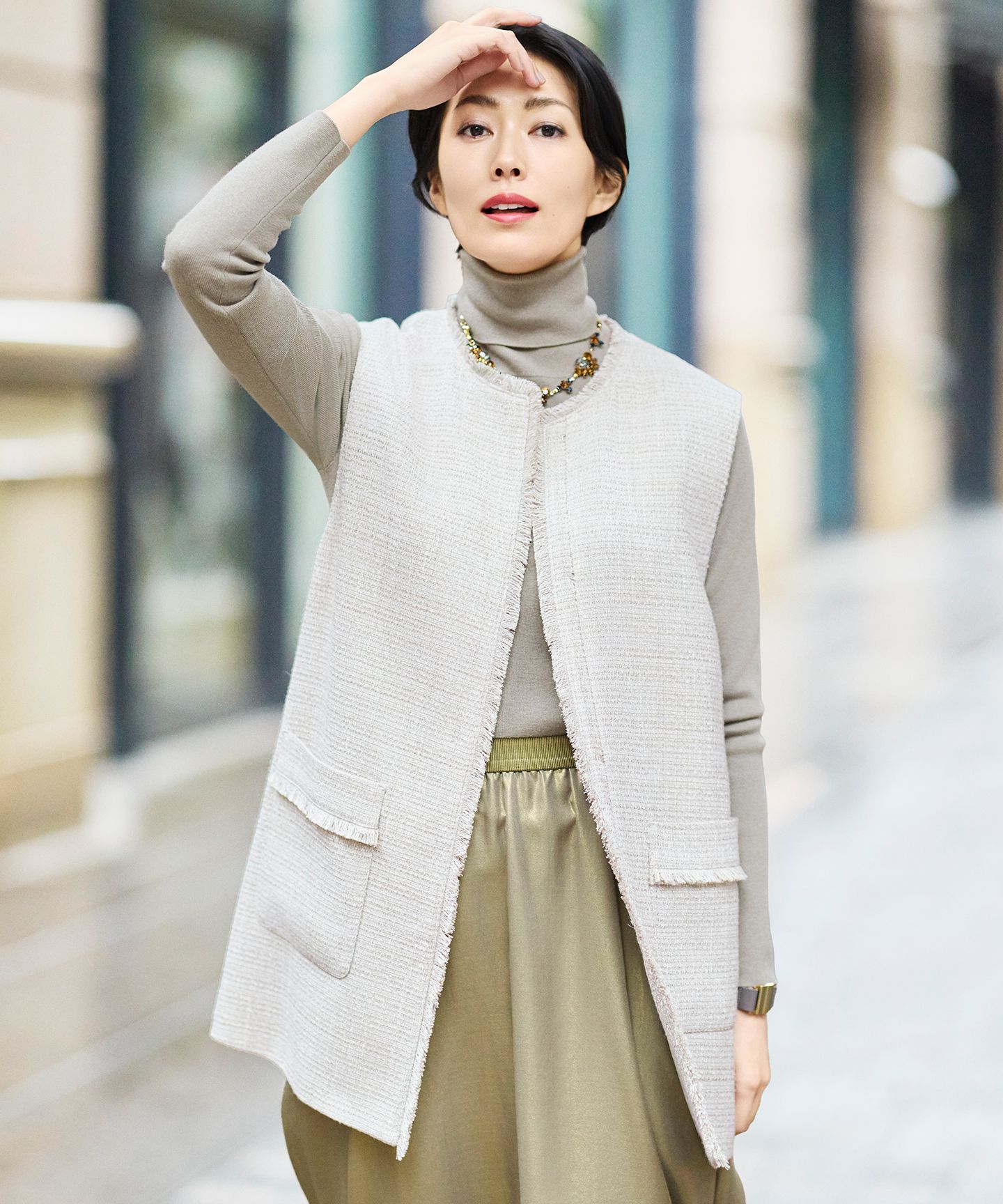 リッチな表情の素材でコーディネートが華やぐデザインジレ■デザインボリュームのあるフリンジと大きく返る襟がお顔周りを華やかに見せてくれるジレです。立体感のあるリッチな表情の素材なので、シンプルなトップスにレイヤードするだけでコーディネートを格上げしてくれます。長すぎず、短すぎない絶妙なレングスで気になる腰周りをカバーしつつ、ワイドパンツやスカートとも合わせやすいバランスです。同素材のスカート(SKWMCA0101)とセットアップでのコーディネートもおすすめです。■素材ざっくりとした表面感が特徴の麻調合繊素材です。奥行きのある表情と、見た目よりも軽く程よいストレッチ性を実現しました。シワになりにくく、接触冷感、UVカットも嬉しいポイントです。■同素材アイテムスカート(SKWMCA0101)※画像はサンプルを使用している為、実際にお届けする商品と仕様、加工、サイズが若干異なる場合がございます。予めご了承ください。※撮影環境の都合上、実際の商品と色味が異なって見える場合がございます。