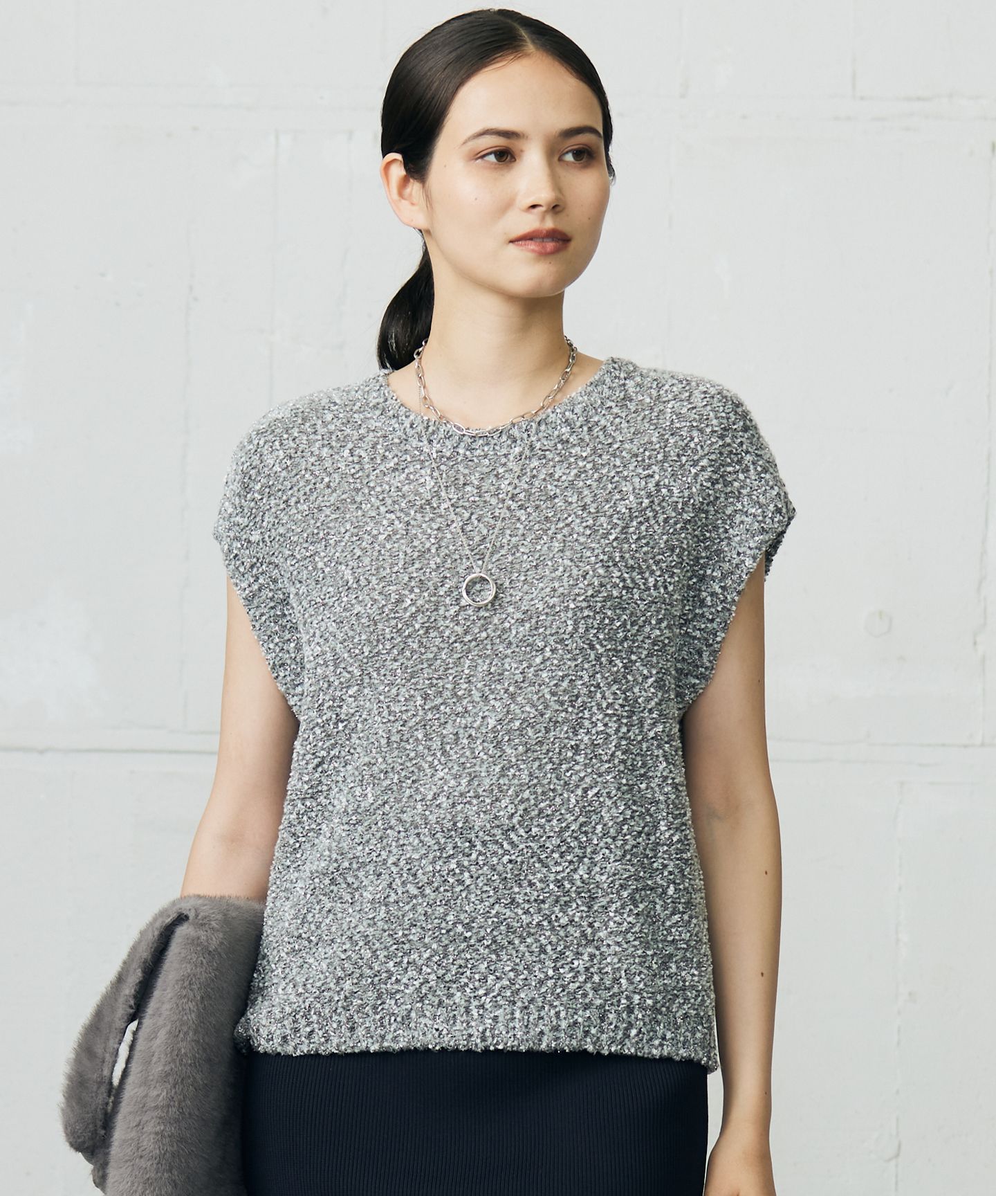 1枚でも、レイヤードアイテムしてもコーデを華やかにしてくれるニットベスト■デザインシンプルで使いやすい、やや肌離れしたフォルムのニットベストです。素材自体に華があるので、スリーブレスでも着て頂け、寒くなってレイヤードアイテムとしてもお使い頂けます。スタイリングに組み込みやすい華やかなトッピングアイテムです。■素材和紙、ラメフラッグヤーン、ウールブークレなど表情、混率共に性質の大きく異なる素材を撚糸することで、色合いや表面感がユニークで華やかな印象に仕上げたミドルゲージファンシーヤーンです。■同素材アイテムカーディガン(KRWMGW0459)※画像はサンプルを使用している為、実際にお届けする商品と仕様、加工、サイズが若干異なる場合がございます。予めご了承ください。※撮影環境の都合上、実際の商品と色味が異なって見える場合がございます。