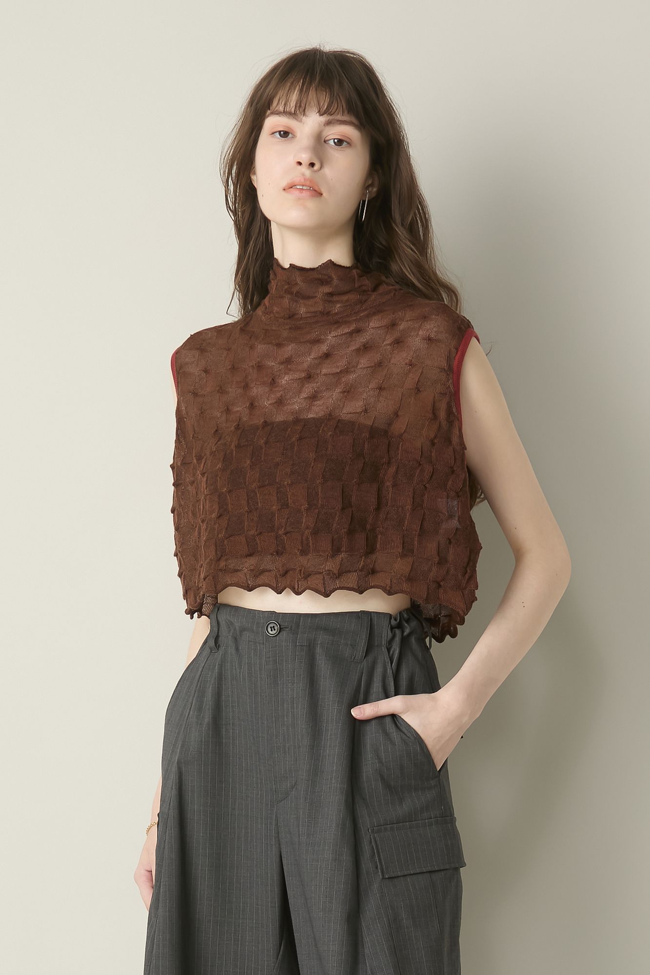 どちらを前にしても着られ、くるんとしたネックがキュートな2WAYアイテム。レイヤードにも効果的なシアー感やノットディテールが着こなしバランスを今っぽく更新。「borlor 菠蘿」(パイナップル)と名付けた新素材で伸縮性にも優れ、コンパクトな着丈も扱いやすく便利です。