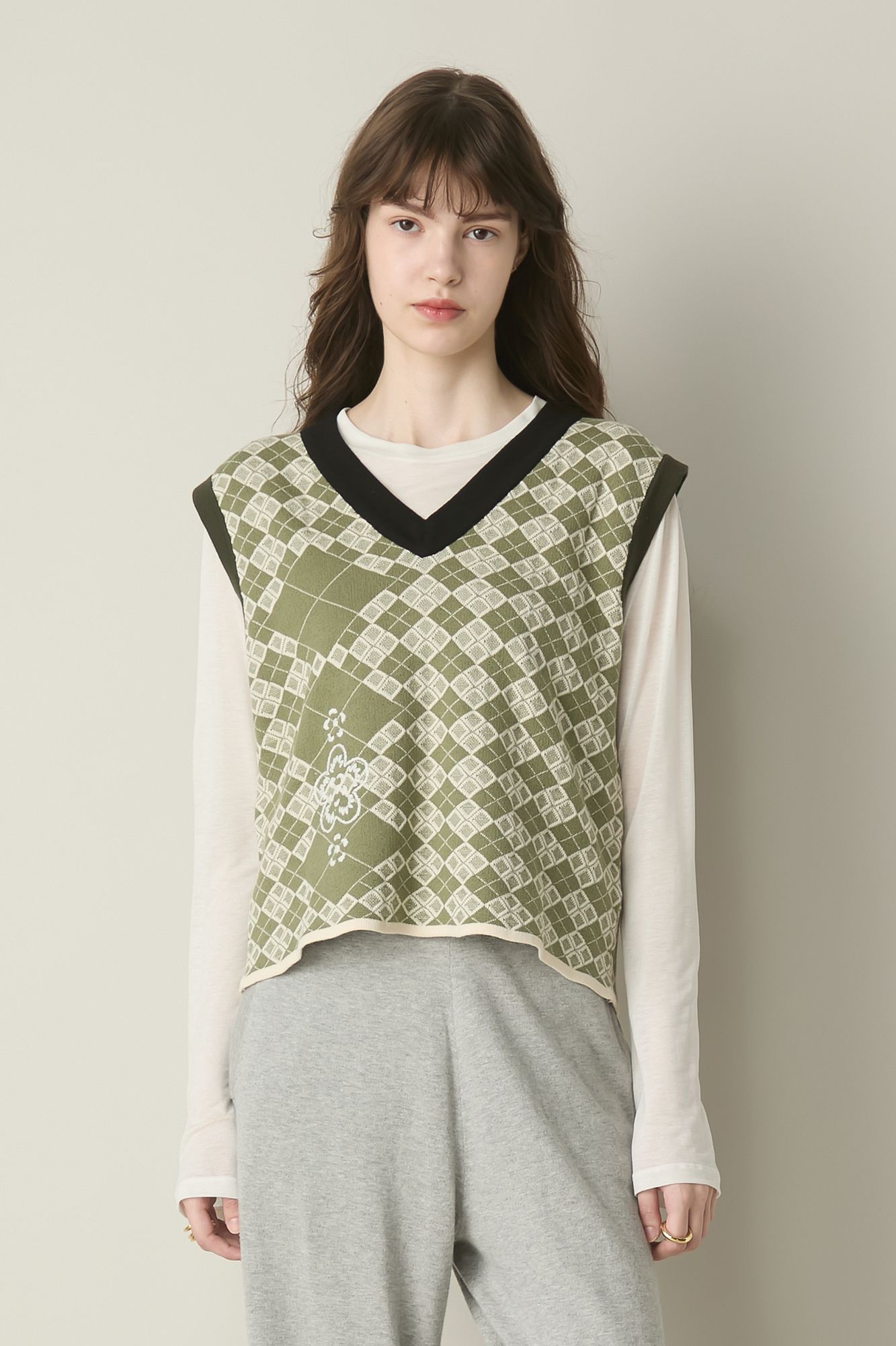 オリエンタル風のアーガイル柄で、個性も際立つオーバーサイズベスト。ニュアンスたっぷりの色味やコンパクト丈で単調に見えない仕上がり。袖口やネックラインの配色切り替えがラフさを抑え、洗練された見た目へと引き上げてくれるアイテムです。