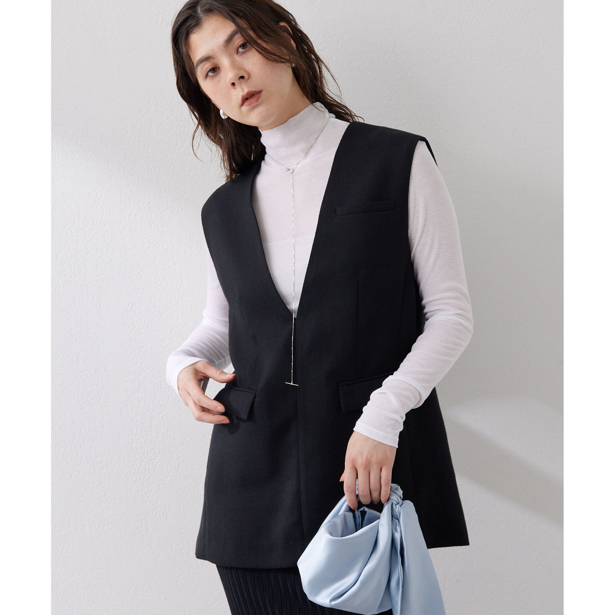 【2023SS】大人のスタイリングに馴染む、きれいめチノ素材のジレ■微光沢のあるチノ素材で品良く仕上げたノーカラーベスト。■クールな印象ながら、女性らしさを演出するコンパクトなシルエット。■ボタンを閉じればノースリーブブラウス感覚で楽しめる、開きすぎないVネックもポイント。■肩にかかるフレンチスリーブのようなシルエットが気になる二の腕をカバー。■Tシャツなどとのレイヤードを楽しむのはもちろん、あえて一枚で着こなしてほしい一着。■同素材のチノタックパンツ(ブランド品番:WGZ1031502A0006)とセットアップで楽しむのもおすすめ。【COLOR】オフホワイト:クリーンな華やかさを叶える、黄味のないホワイト。ベージュ:上品な雰囲気をを演出する、女性らしい淡色ベージュ。ブラック:大人をカッコ良く魅せてくれる、マニッシュなブラック。【MATERIAL】エアー加工を施したヴィスコースと太番手の綿の交織ツイル素材。FSC認証を受けたヴィスコースを使用したサステナブルな素材で、しっかりとした肉感がありながら軽く、独特なドライタッチ、嵩高性が特徴。----------------------------------------------------洗濯方法:手洗い可透け感:なし裏地:あり伸縮性:なし光沢感:なし----------------------------------------------------※画像の商品はサンプルです。実際の商品と仕様、色味が若干異なる場合があります。※入荷状況によりお届け予定が前後する場合があります。予めご了承ください。#otona_easycare