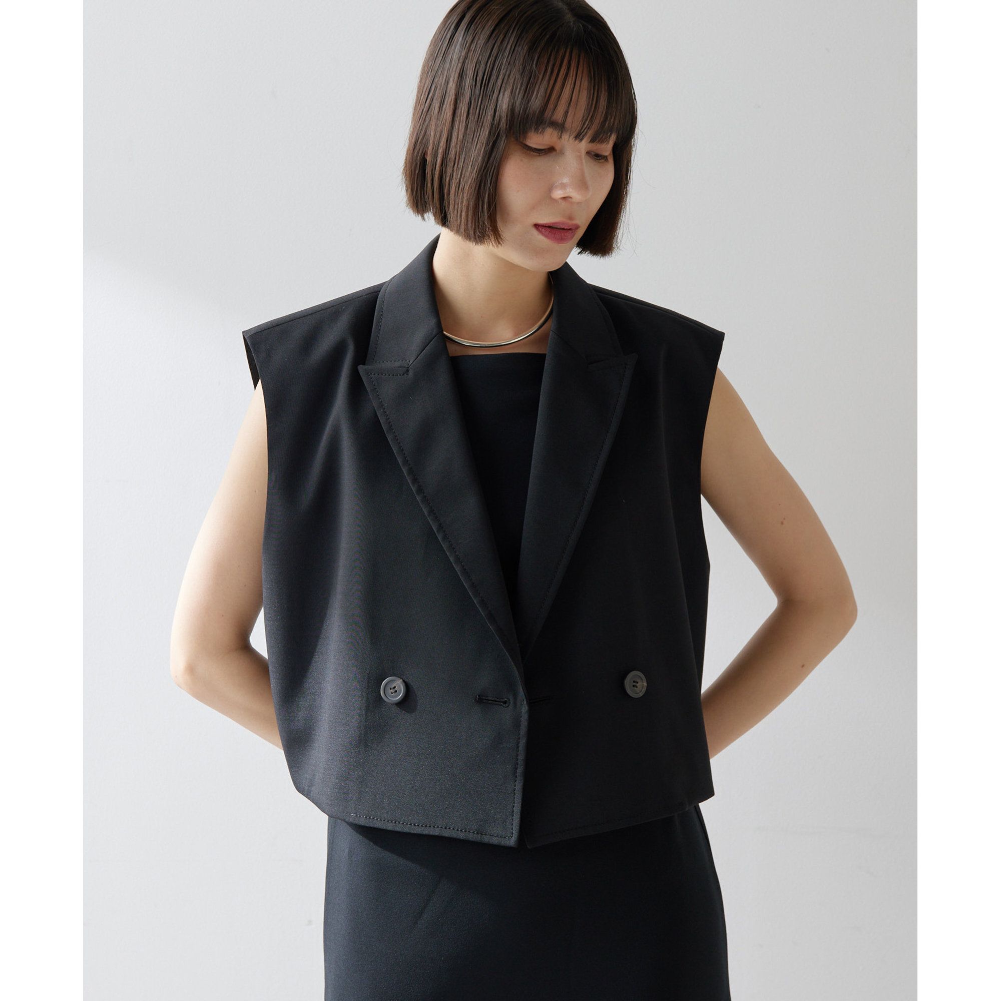 【2025SS】着こなしを格上げしてくれるスリーブレスジャケット■コンパクトな着丈がスタイルアップを叶えるテーラードベスト。■ジャケットの袖を取ったような存在感のあるシルエットが魅力。■ノースリーブでの着用はもちろん、広めのアームホールで重ね着もしやすくTシャツなどに重ねても◎。■テーラード型できれいめにもカジュアルにも着回しやすいのもポイント。■いつものコーディネートにプラスするだけで、着こなしをランクアップしてくれるアイテム。【COLOR】ベージュ:軽やかな着こなしを楽しめる明るめのアイボリー。ブラック:スタイリッシュな印象に仕上げてくれるブラック。【MATERIAL】シワになりにくくドライなのが特徴の、ポリエステルフィラメント使いのトロピカル素材。----------------------------------------------------洗濯方法:ドライクリーニング透け感:なし裏地:あり伸縮性:なし光沢感:なし----------------------------------------------------【注意事項】・画像の商品はサンプルです。実際の商品と仕様、加工が若干異なる場合があります。また 、パソコンやスマートフォンのモニター環境などにより、色味が違って見える場合がございます。・店頭及び屋外での撮影画像は、光の当たり具合で色味が違って見える場合があります。商品の色味は、スタジオ撮影の画像をご参照ください。・入荷状況により、お届け予定が前後する場合があります。・お客様への発送が店頭販売より遅れる場合があります。・追加生産商品は、一部の店舗、通販で販売中の場合があります。予めご了承下さい。