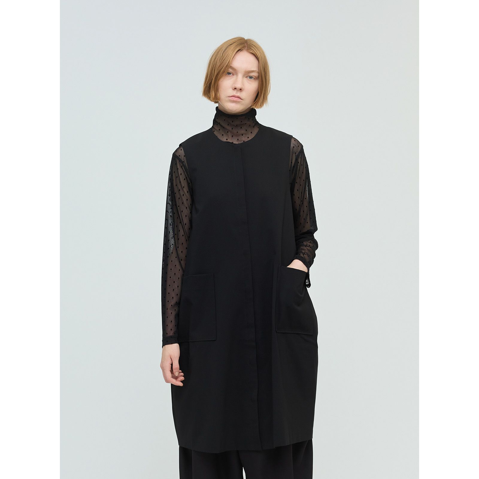 ジャケットの袖を落としたようなデザインを表現しました。長めの丈にしており、ワンピースでもジレとしても着こなしができる1枚です。フロントは比翼仕立てにしているのでよりすっきりとしています。しっかりとしたハリのある生地感で胸に蓋付ポケットが二つ、手がすっぽりと入る大き目のポケットが付いています。長めの丈ですが、小柄な方にも着こなせるロングジレです。