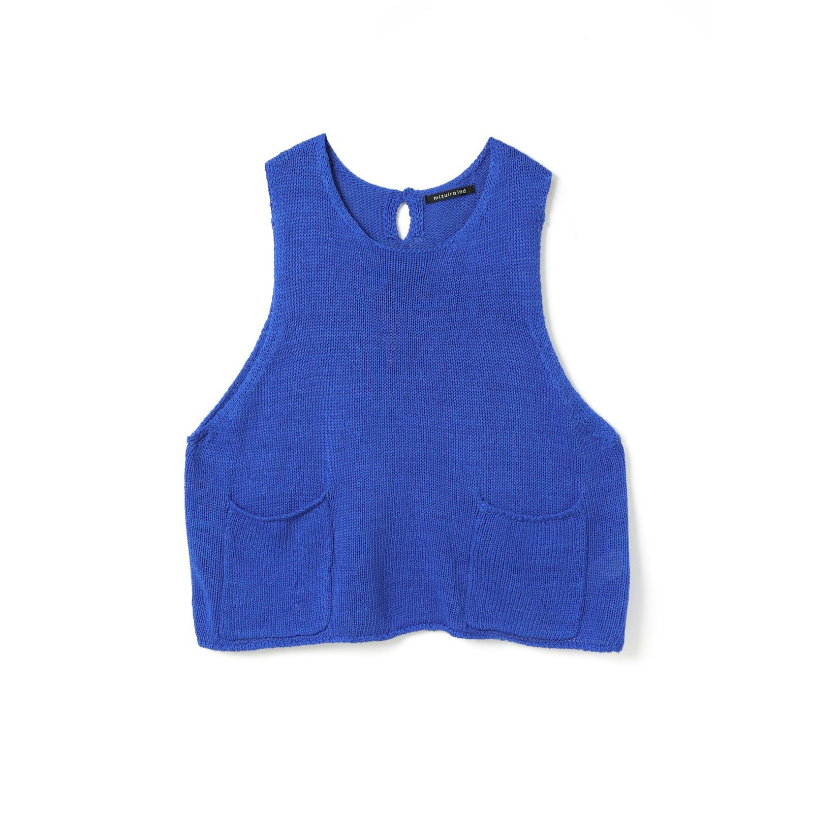 夏場の重ね着アイテムにお勧めです。落着きのあるニット地は今季人気のあるシアー使い。透け感があるので涼し気な印象を演出しています。ヒップの隠れる丈でmizuiro ind人気のデザインベストです。ノースリーブでも素敵で長く愛用していただけます。お洗濯もできるニットです。