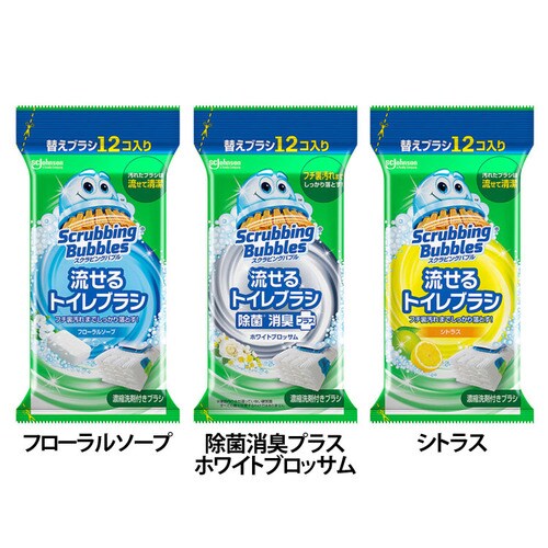 【除菌消臭プラス ホワイトブロッサム】汚れたブラシを流せるから清潔。乳酸成分が便器のフチ裏もしっかり除菌。消臭成分が悪臭分子と結合して中和分解。【シトラス】濃縮洗剤が汚れを分解・・・水に濡れるとブラシについた濃縮洗剤が溶け出します。ふち裏にもぴったりフィット・・・ハンドルのカーブが便器のふち裏にもぴったりフィットします。ブラシはワンタッチで便器にポイ・・・汚れたブラシに触らずにトイレにサッと流せるから清潔です。シトラスの香り